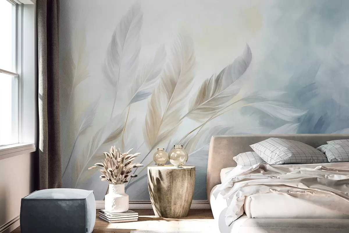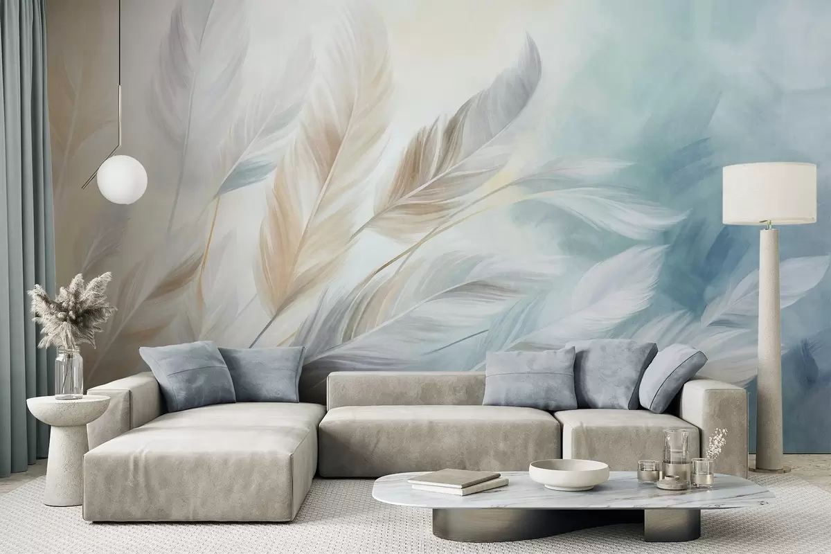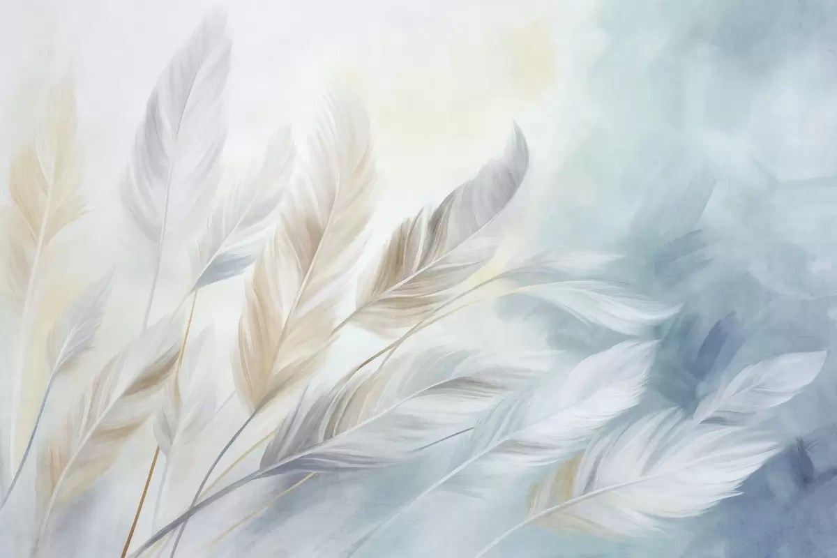 Fototapeter Strukturerte pastellfargede fjær med myke, spisse kanter, mot en bakgrunn i akvarellstil Nr. w09833