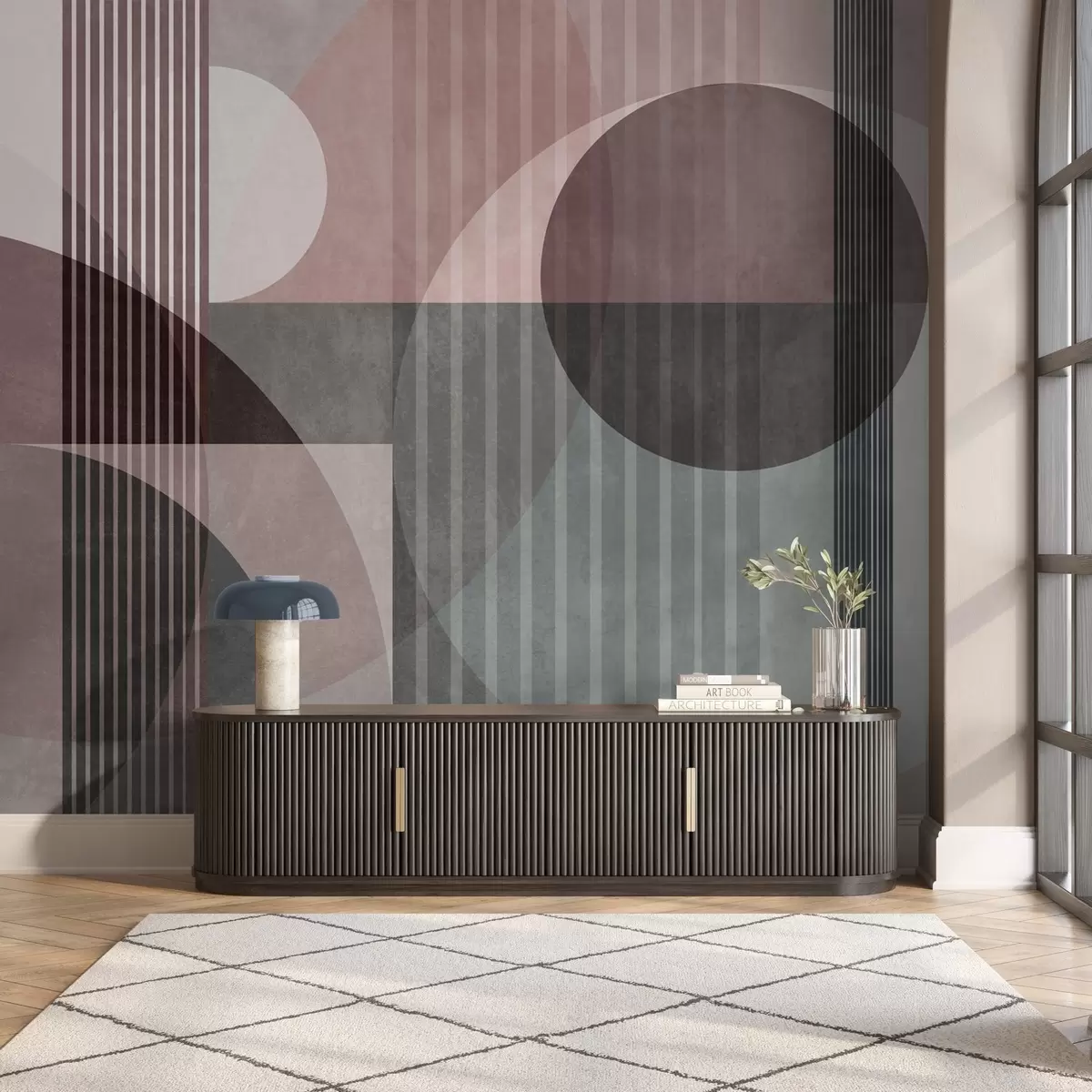 Fototapeter Abstrakte geometriske former med sirkler og linjer, dempede farger, strukturert og lagdelt komposisjon Nr. w09834v1