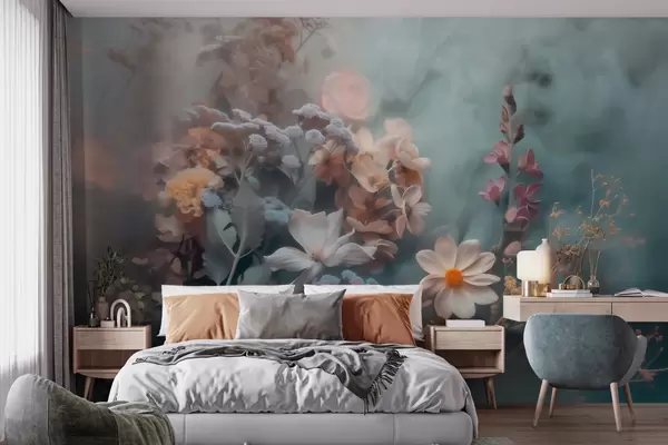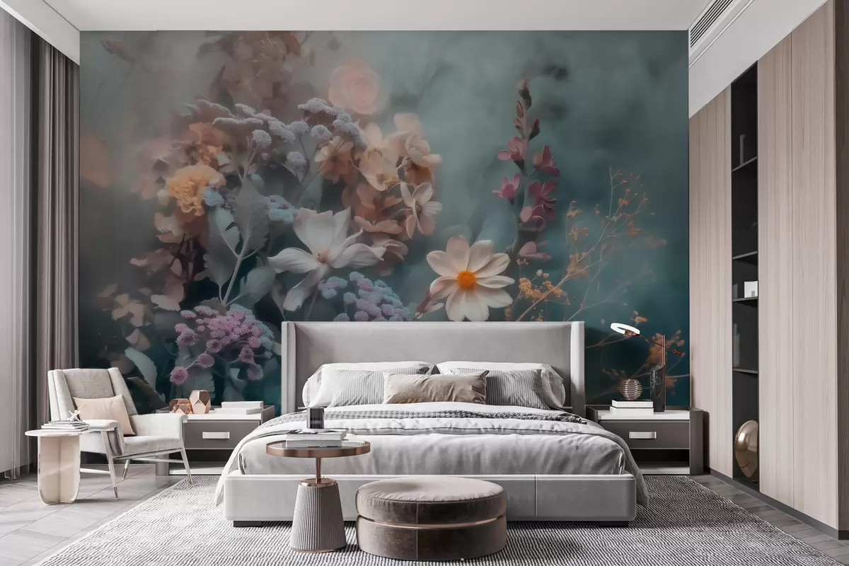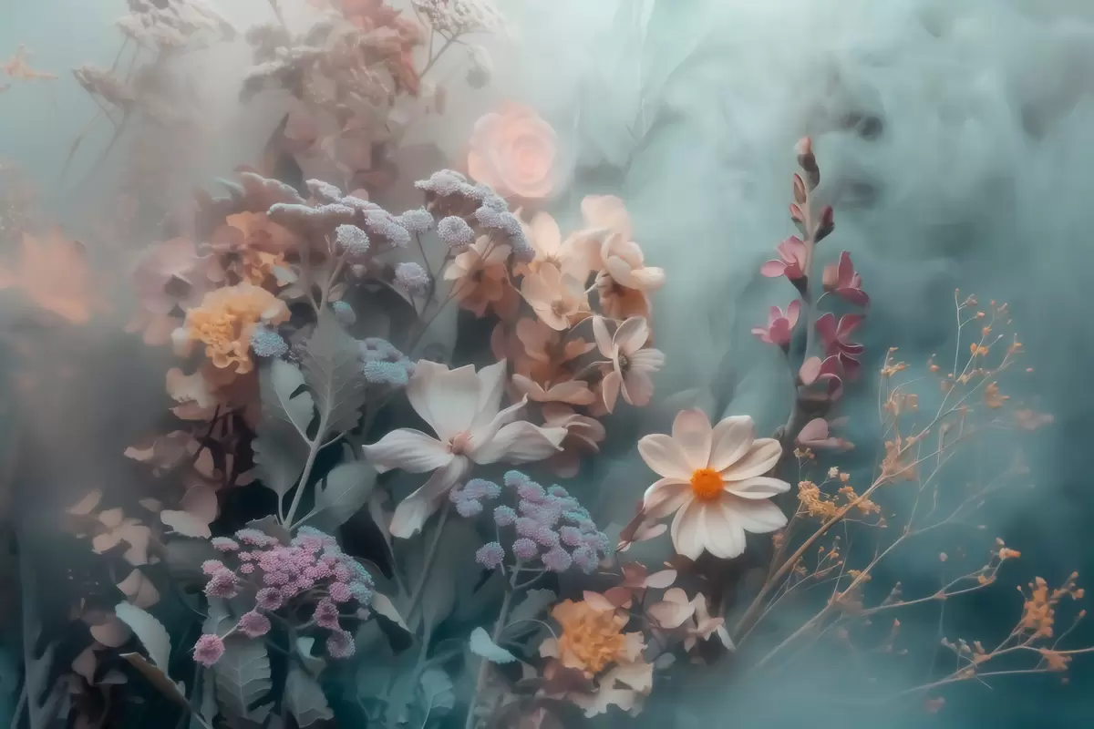 Fototapeter En drømmende sammensetning av villblomster i et lett slør av pastellfarger Nr. w09846