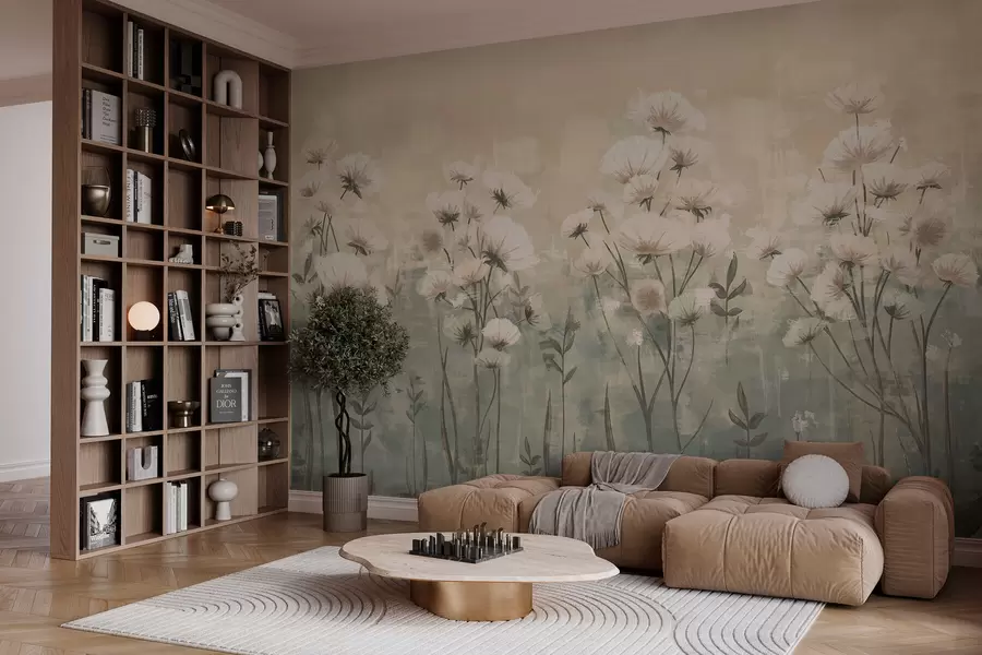 Blomsterornament, minimalisme, strektegning, boho-stil, rustikk, pion, tusenfryd, beige farger, eng