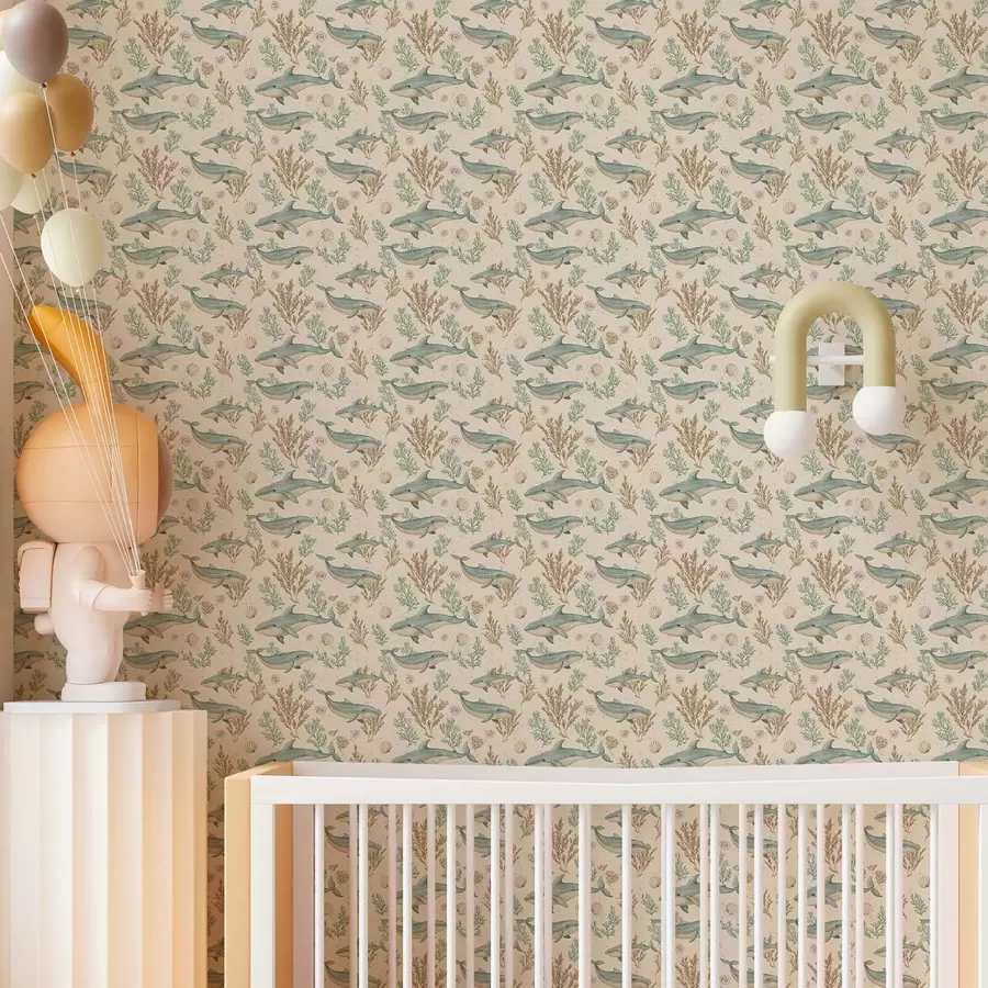 Blågrønne folkemotiver med blomster og blader på kremfarget bakgrunn