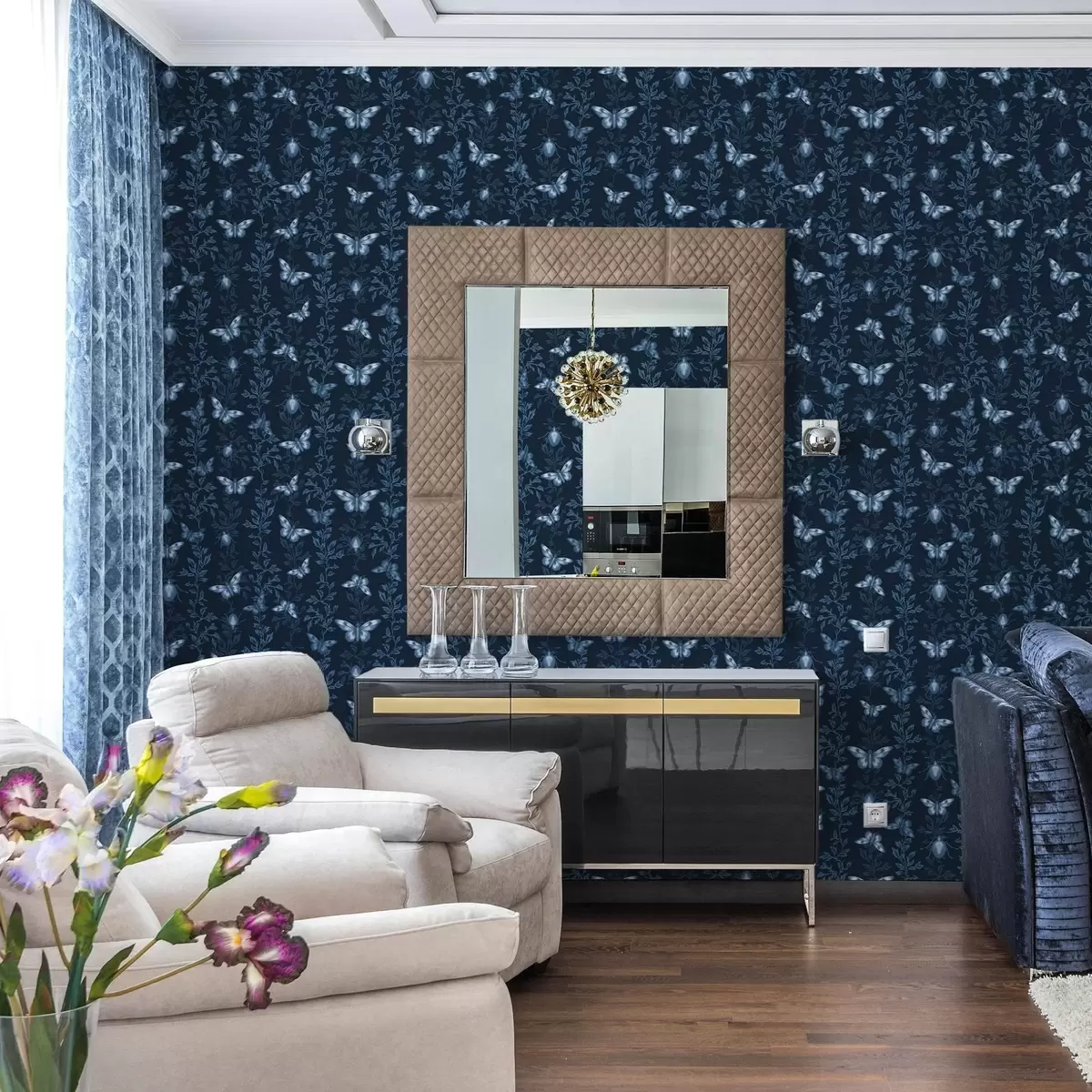 Tapet Komposisjon med sommerfugler, blader og insekter på blå bakgrunn Nr. a00073