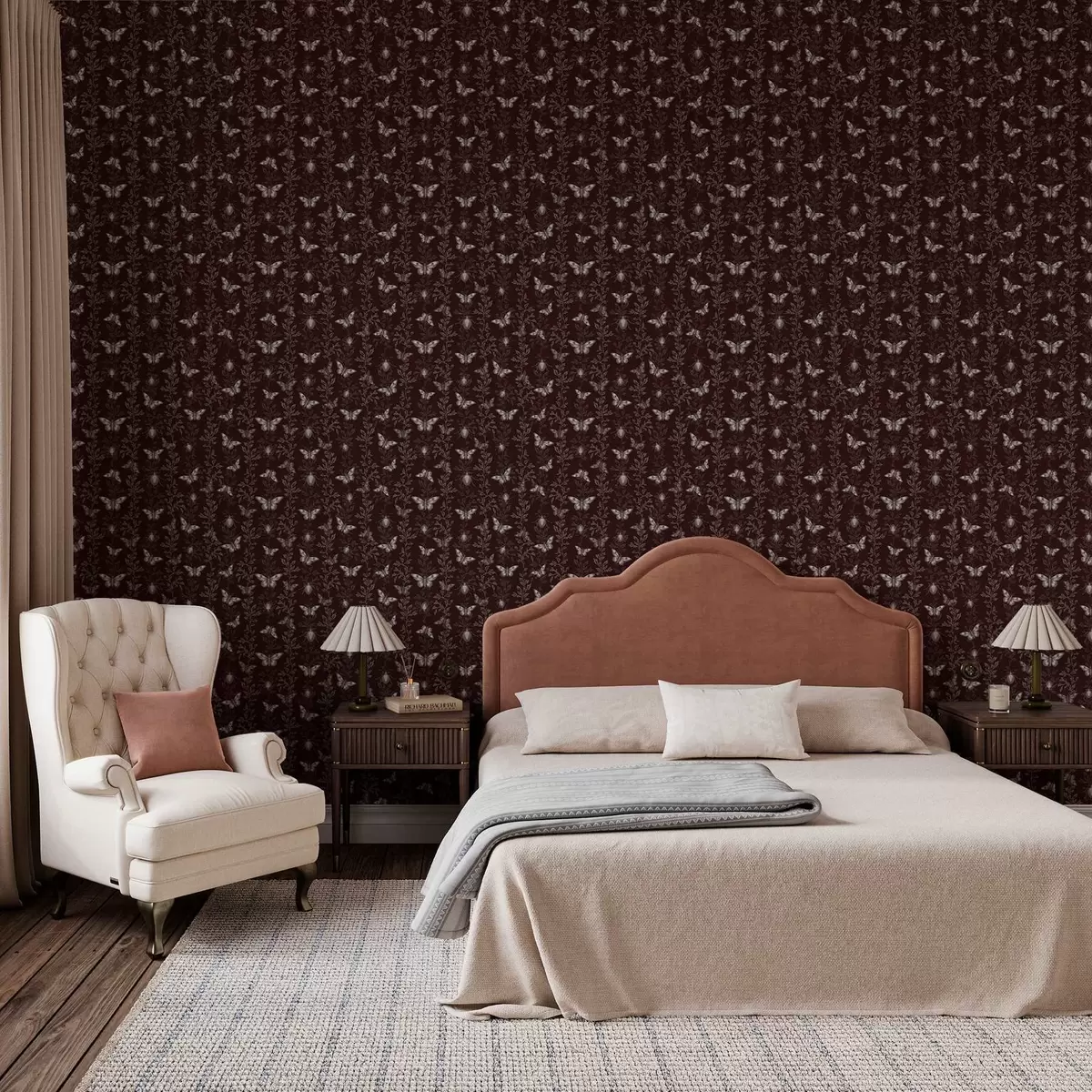 Tapet Komposisjon med sommerfugler, blader og insekter på mørk bakgrunn Nr. a00073v1