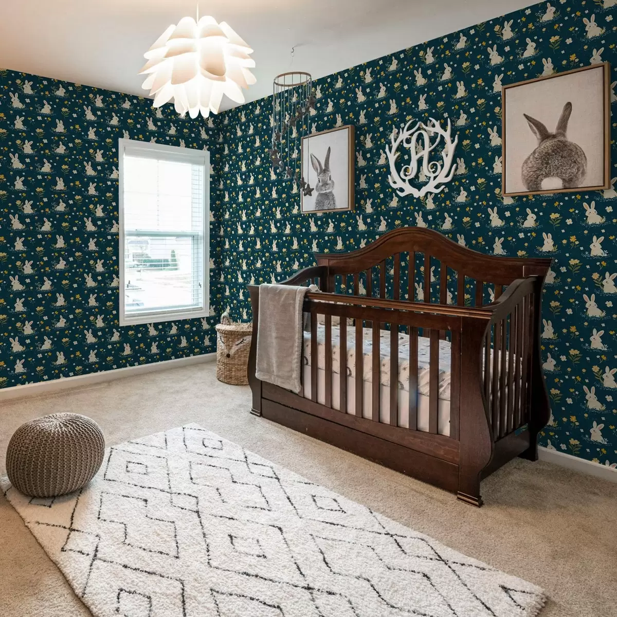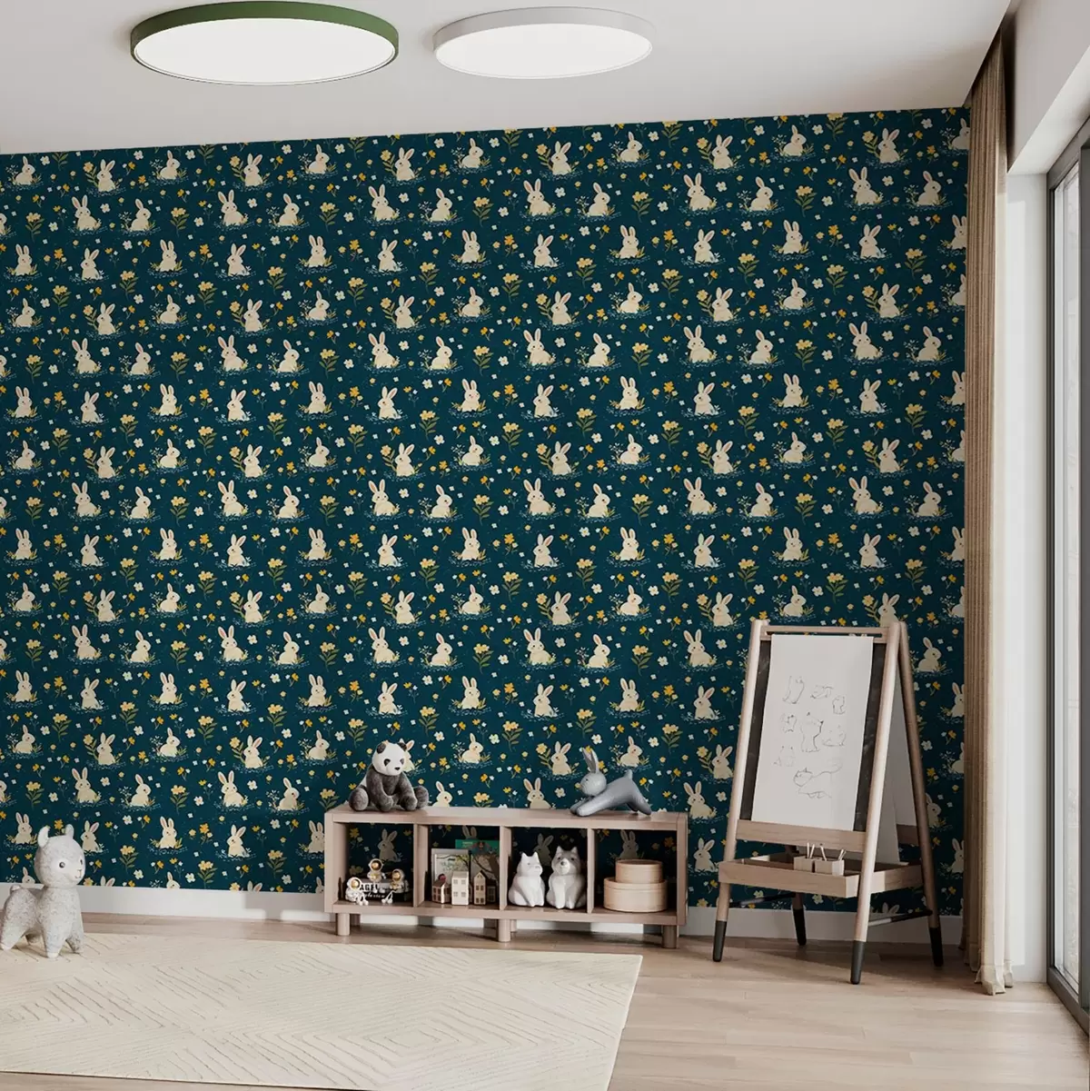 Tapet Kaniner i gress og blomster på mørk bakgrunn Nr. a00080