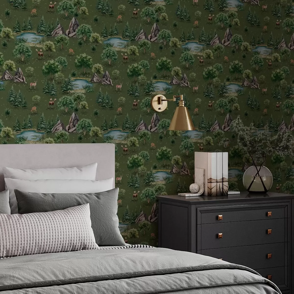 Tapet Hjort ved innsjøen med trær og steiner Nr. a00086