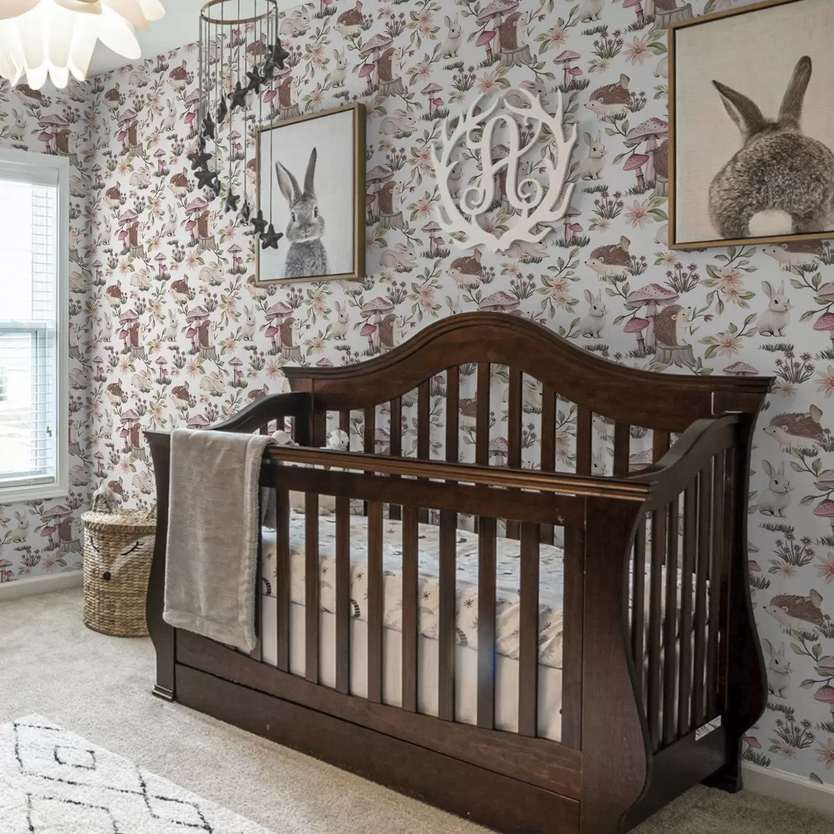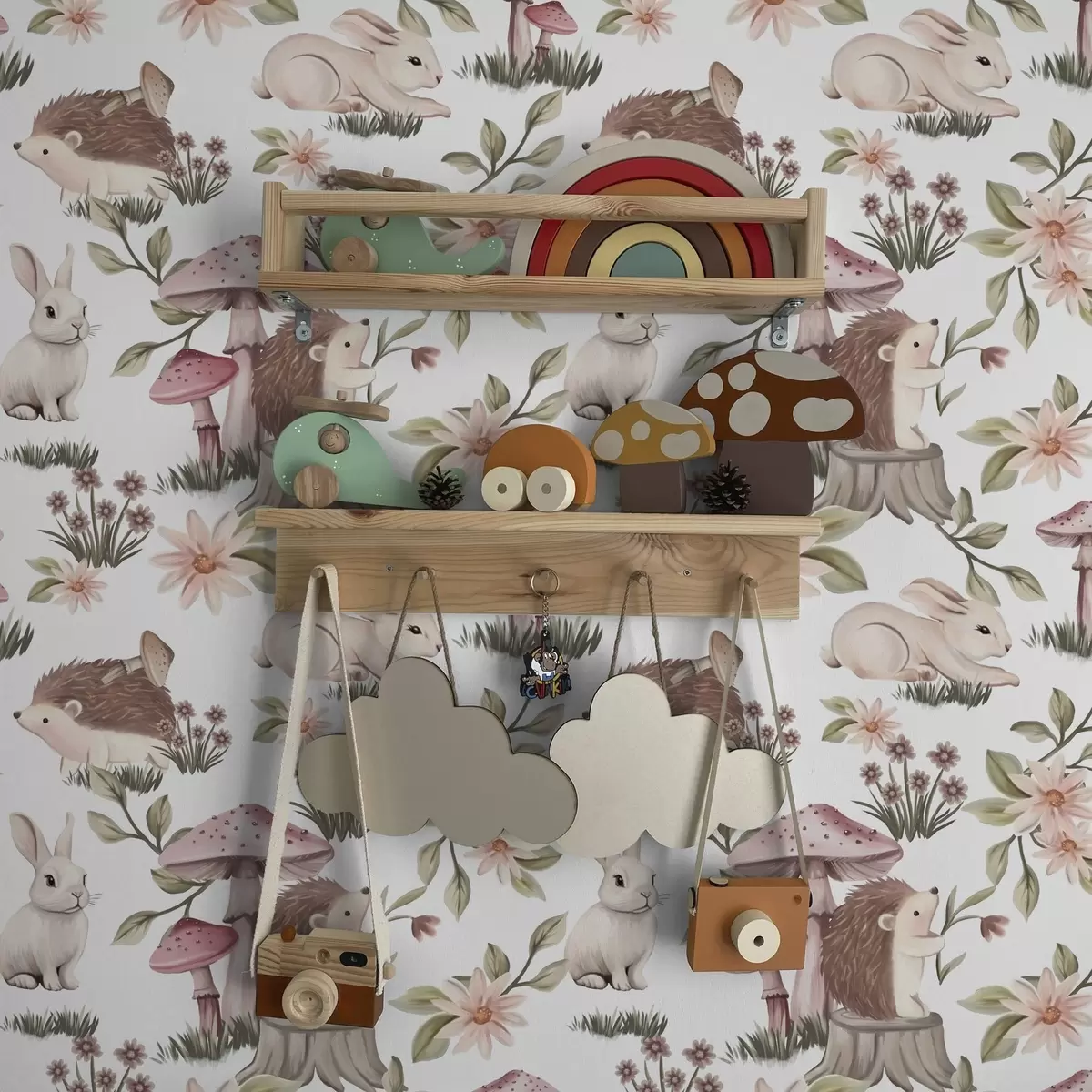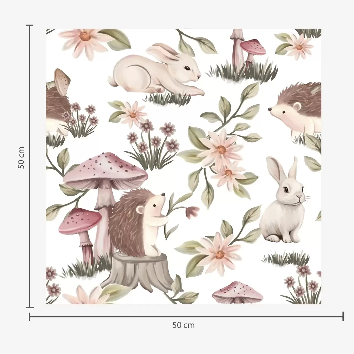Tapet Pinnsvin og kaniner på hvit bakgrunn med delikate blomster og sopp Nr. a00111v2