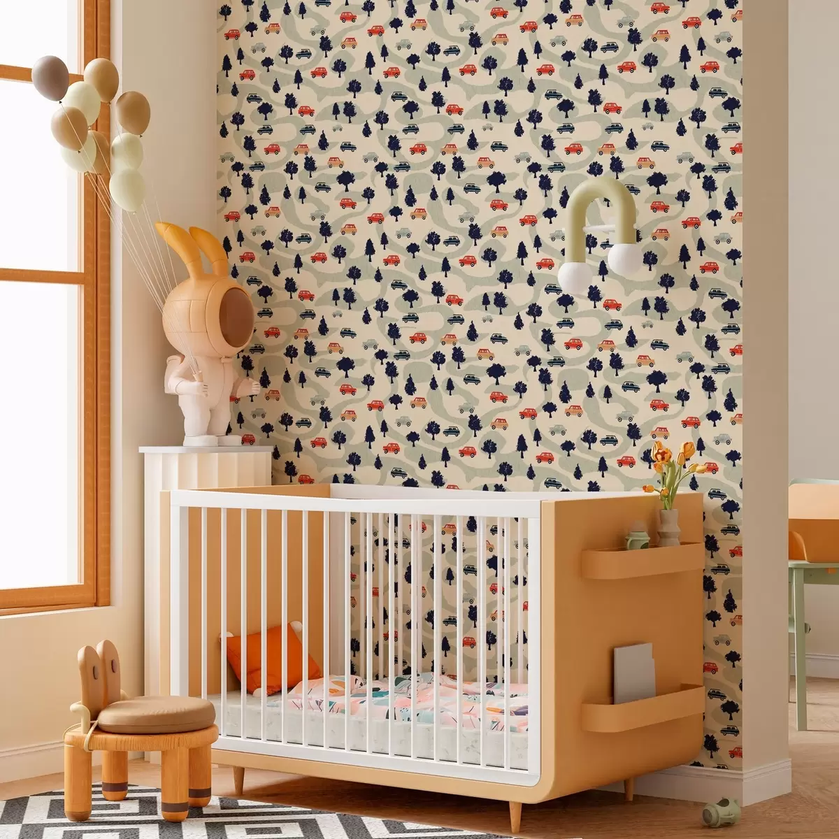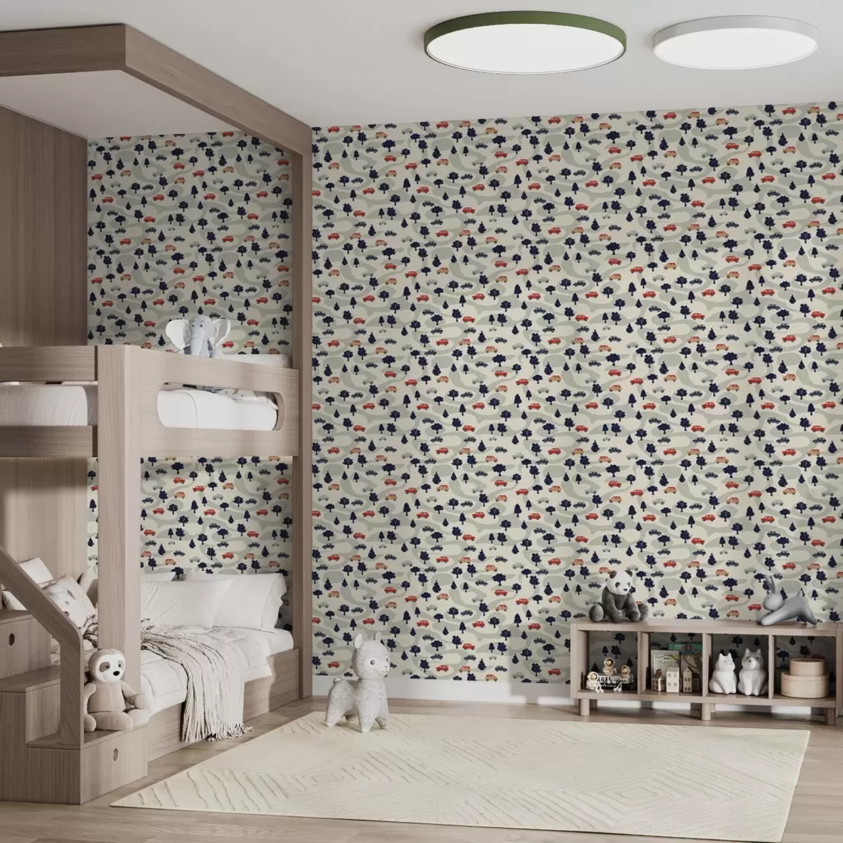 Tapet Morsomme biler blant trærne på en kremfarget bakgrunn Nr. a00119