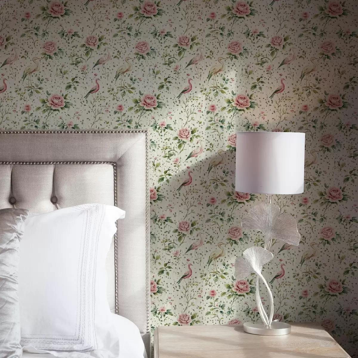 Tapet Pastellrosa roser og fugler i shabby chic-stil Nr. a00201
