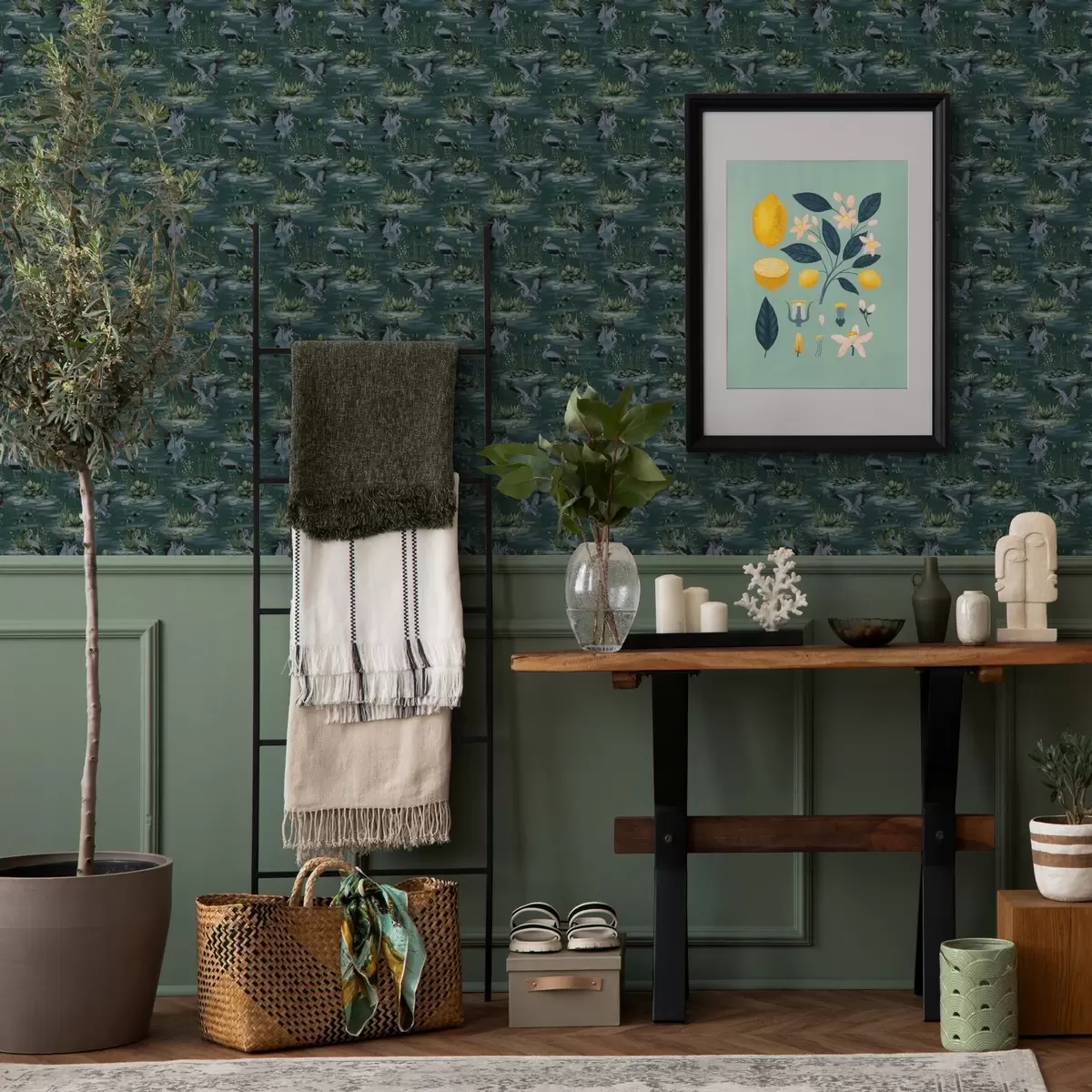 Tapet Scener med hegre på bakgrunn av dammer og vannliljer Nr. a00202