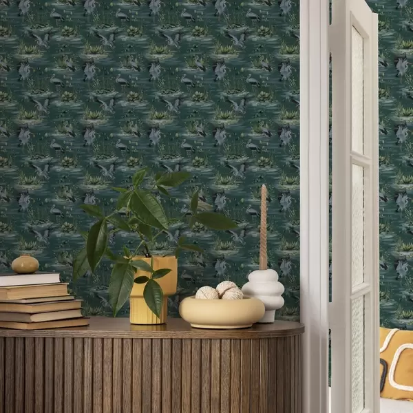 Tapet Scener med hegre på bakgrunn av dammer og vannliljer Nr. a00202