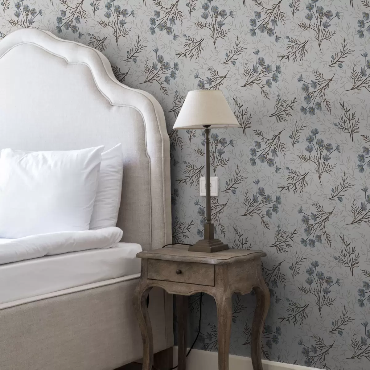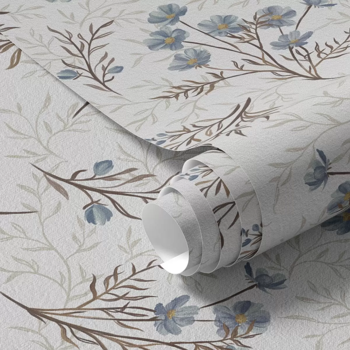 Tapet Blå blomster og lyse grener på hvit bakgrunn Nr. a00265v1