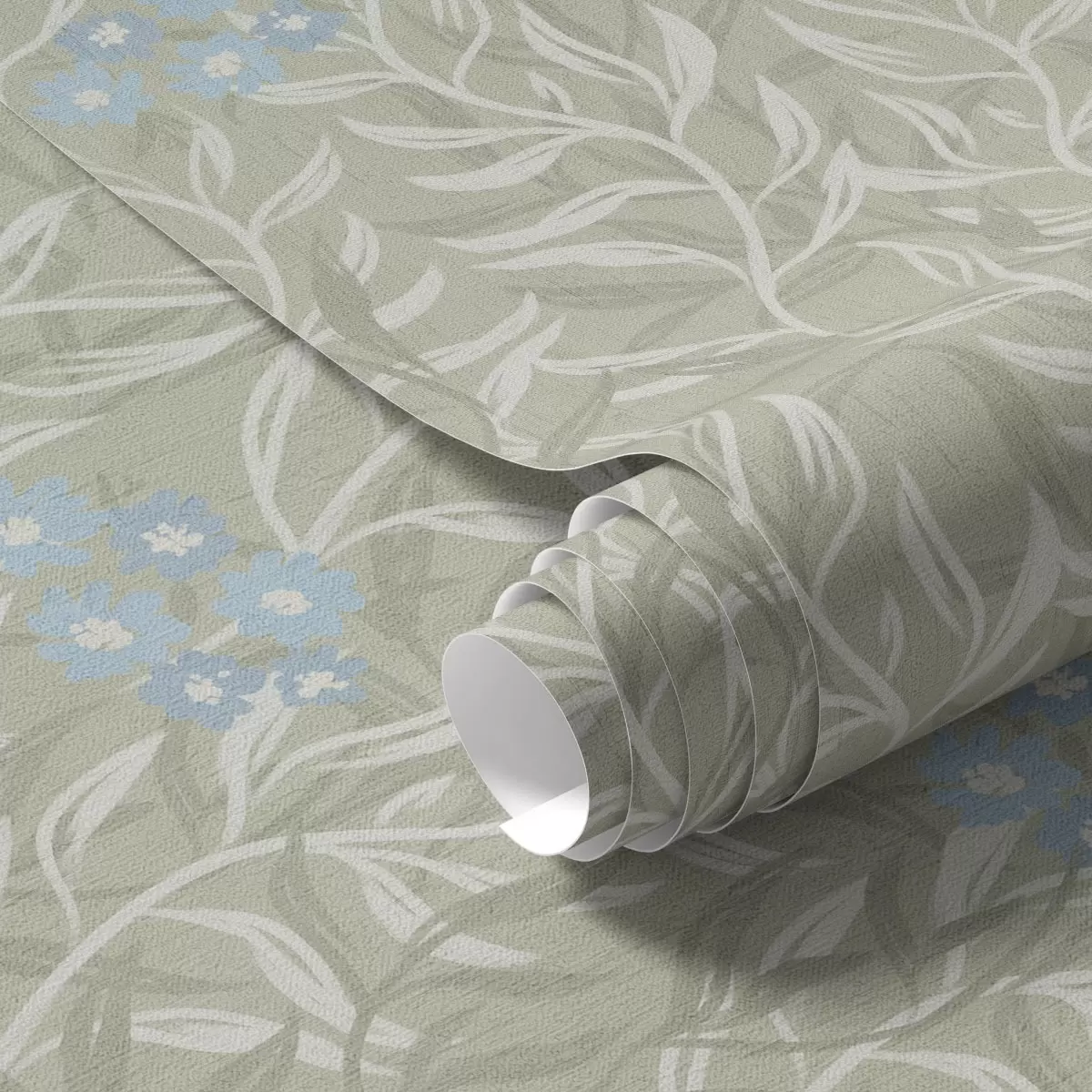 Tapet Grønn bakgrunn med hvite grener og blå blomster Nr. a00268v1