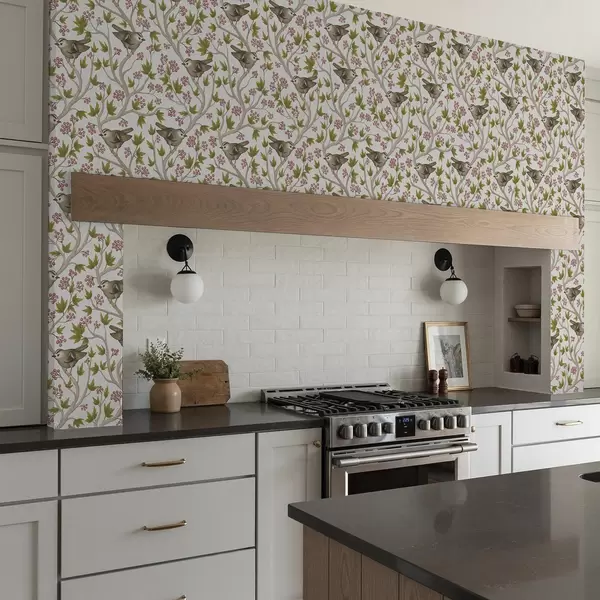 Tapet Fugler på grener med blader og bær på hvit bakgrunn Nr. a00283