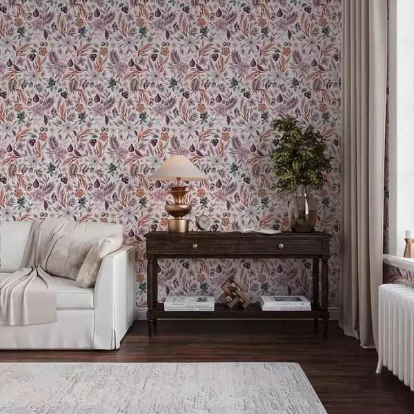 Tapet Lyse bær, blomster og blader i akvarellstil Nr. a00298