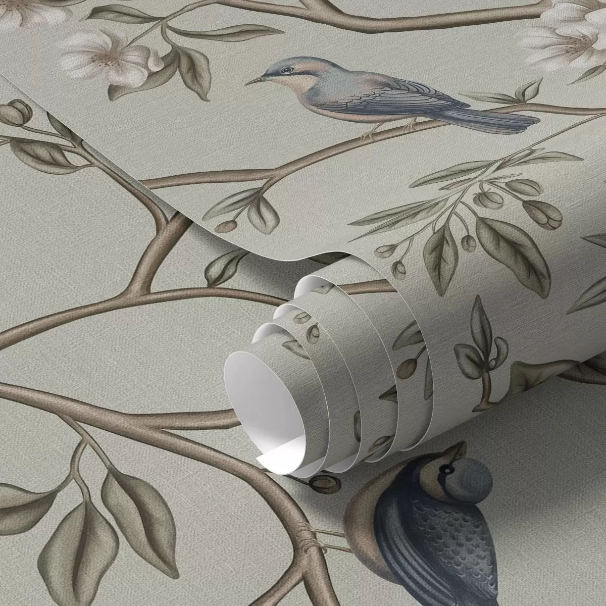 Tapet Grener med fugler og hvite blomster på en delikat bakgrunn Nr. a00303