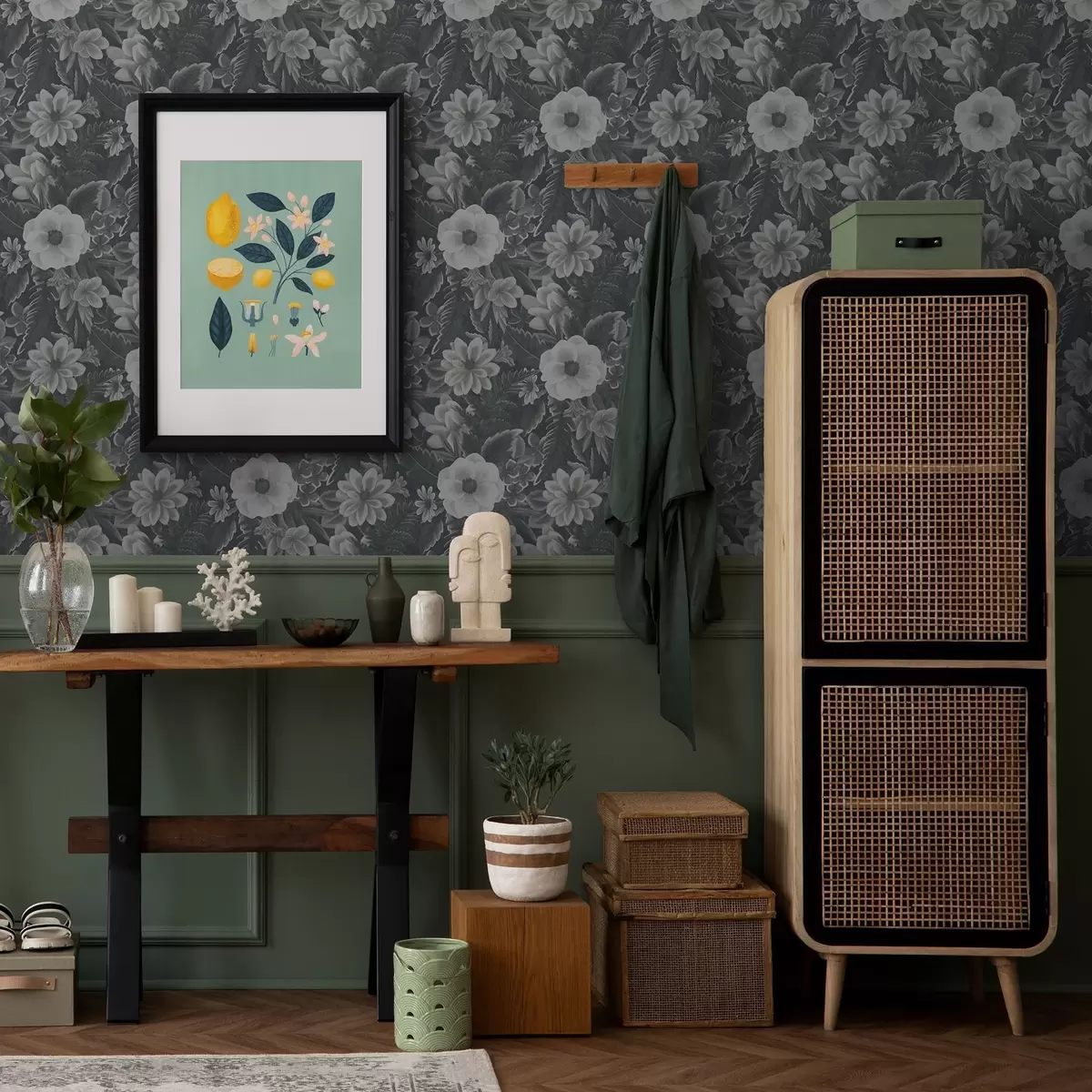 Tapet Grått og hvitt blomstermønster med retroeffekt Nr. a00307