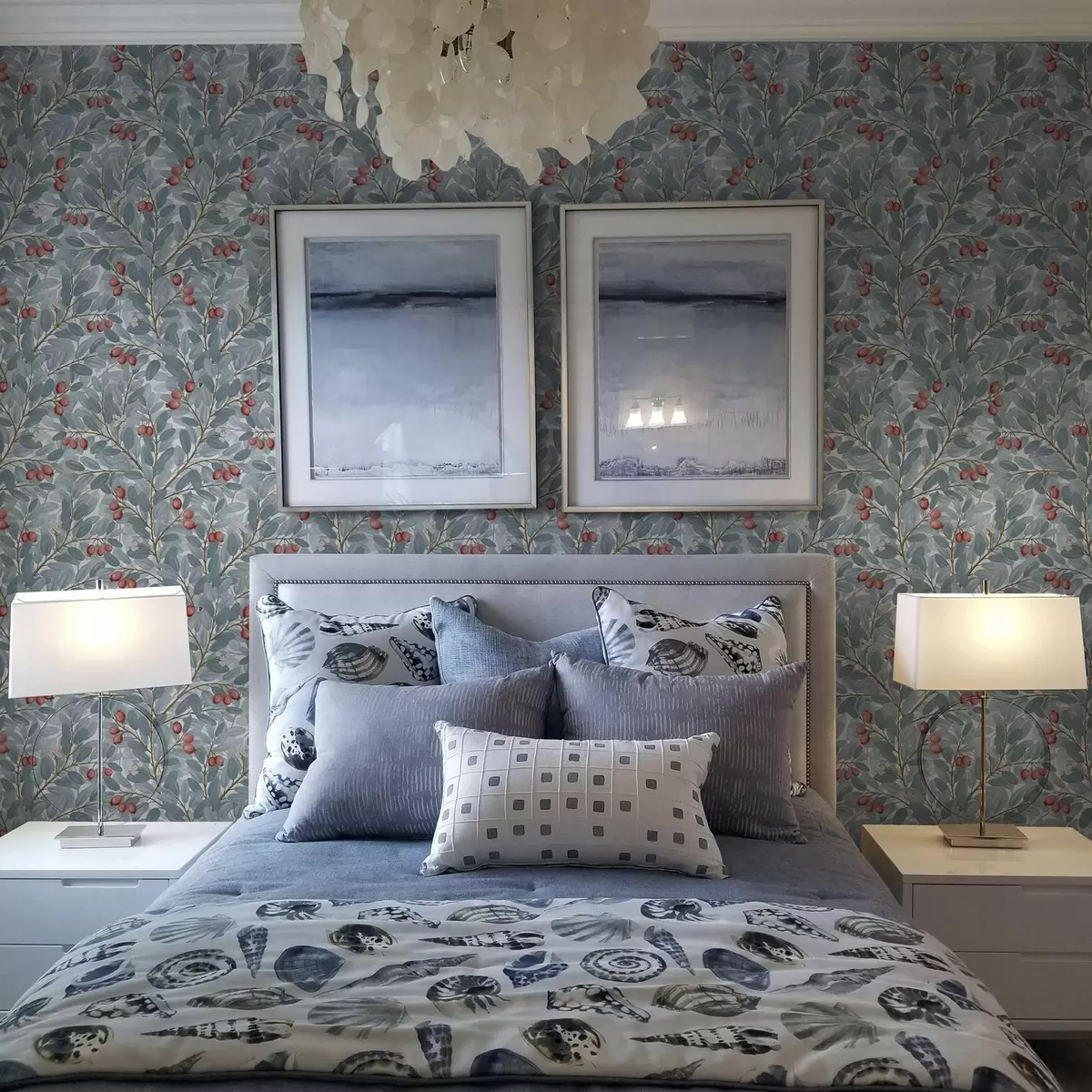 Tapet Blå blader med kvister av røde bær Nr. a00309