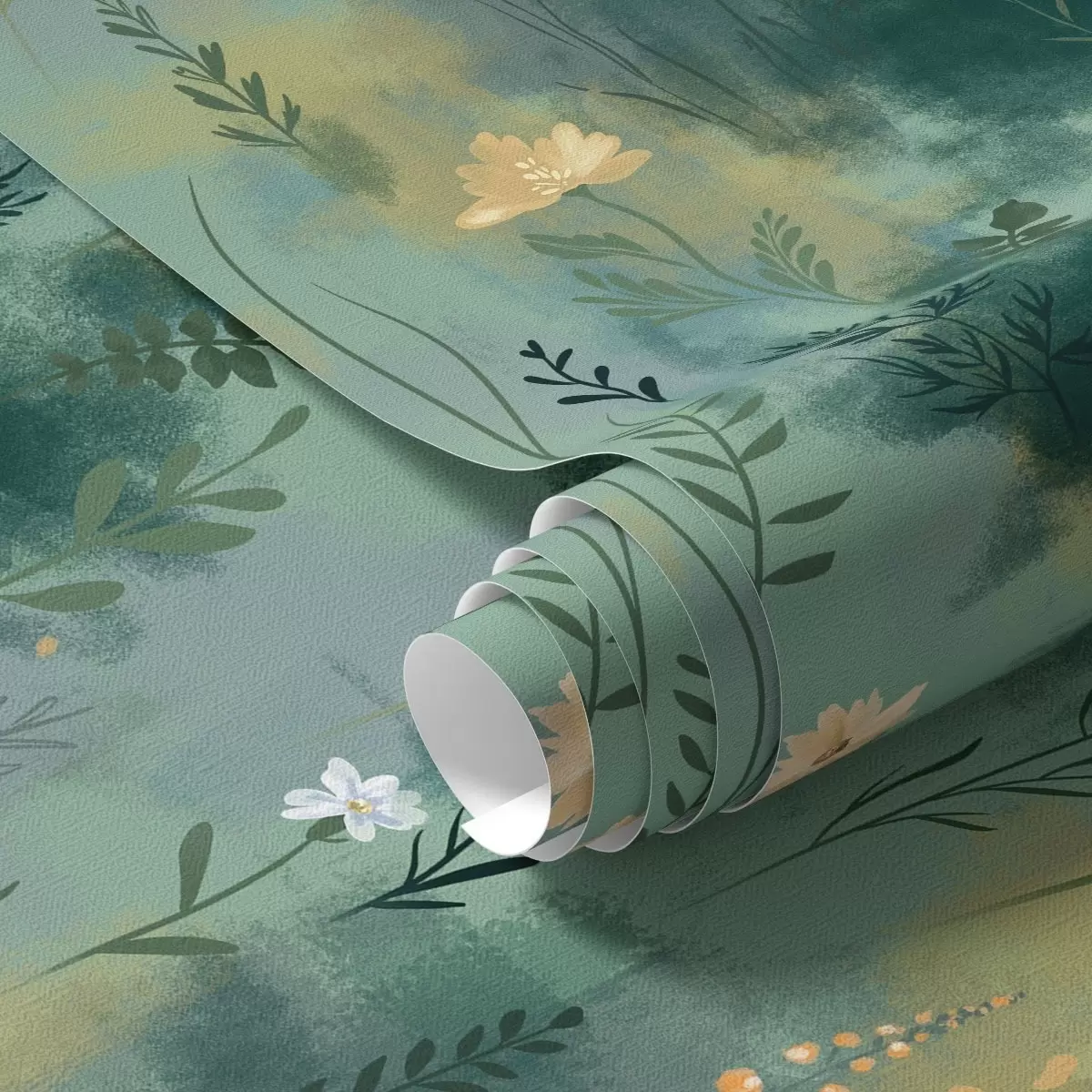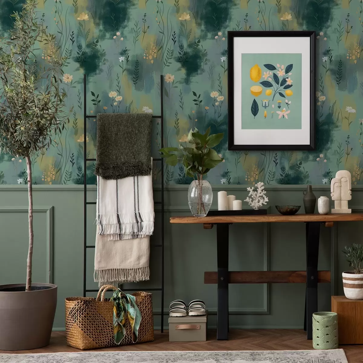 Tapet Akvarellabstraksjon med blomster på grønn bakgrunn Nr. a00312