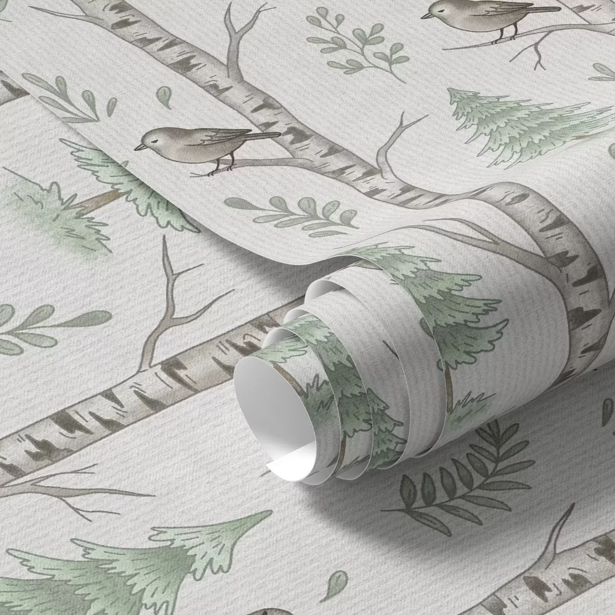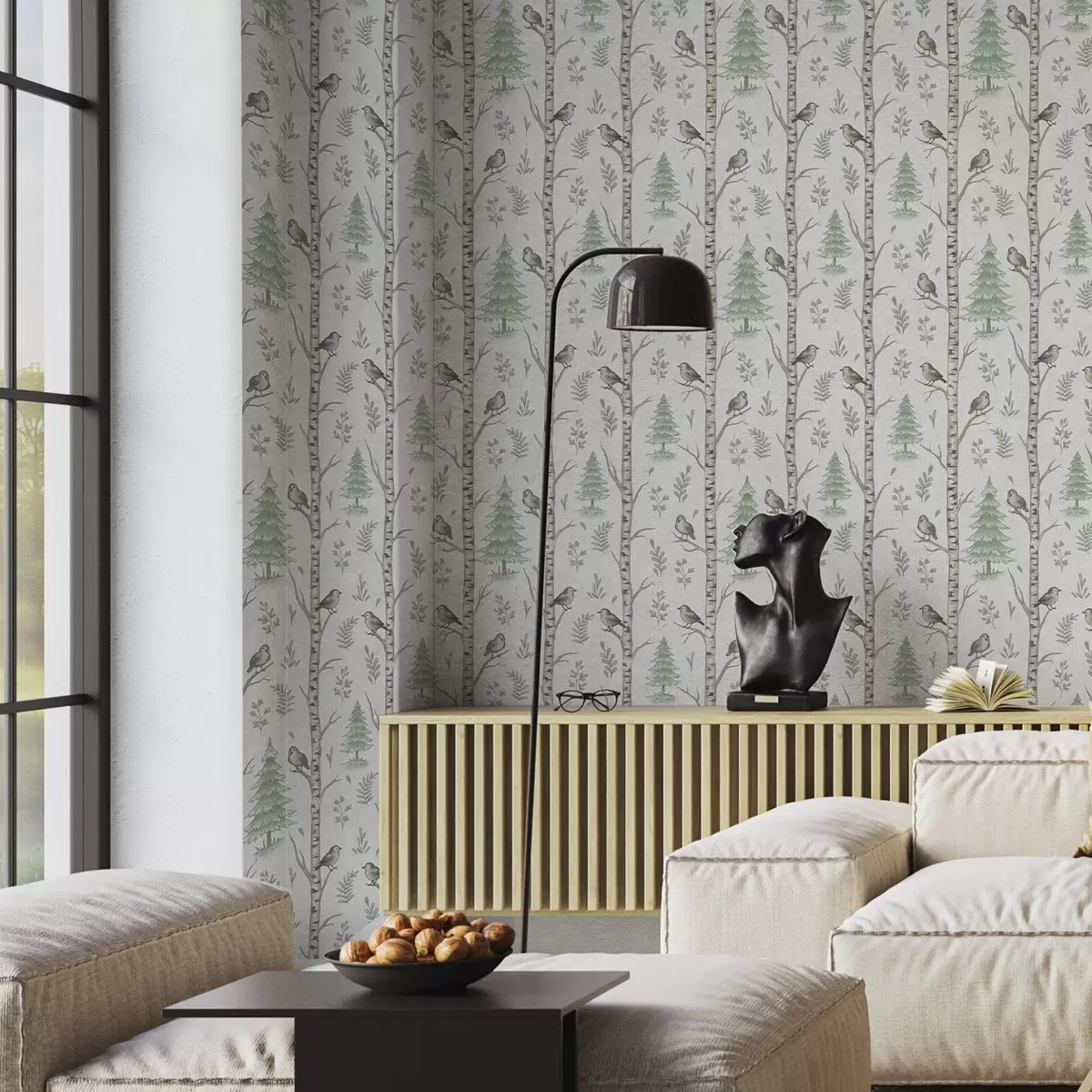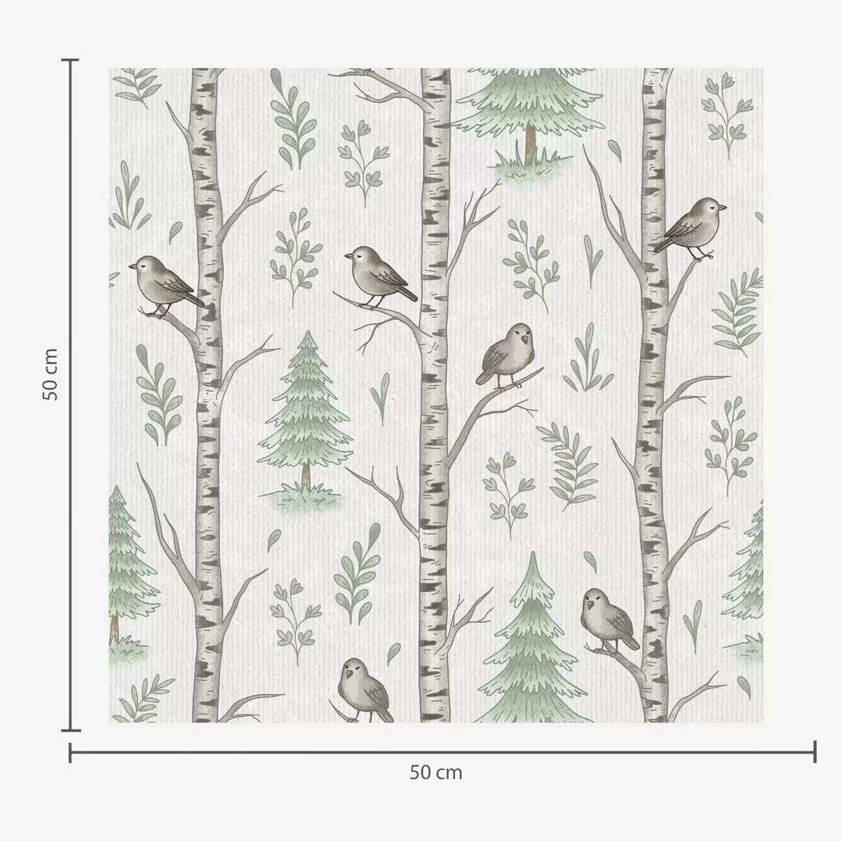 Tapet Bjørketrær med fugler i en lysegrønn skog Nr. a00316