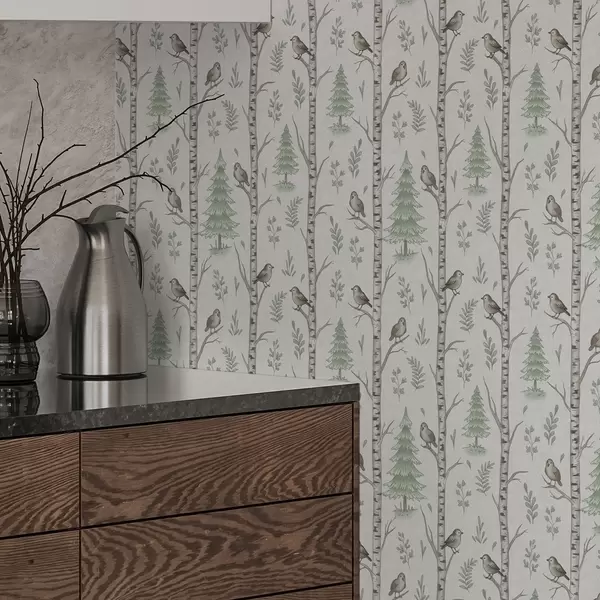 Tapet Bjørketrær med fugler i en lysegrønn skog Nr. a00316