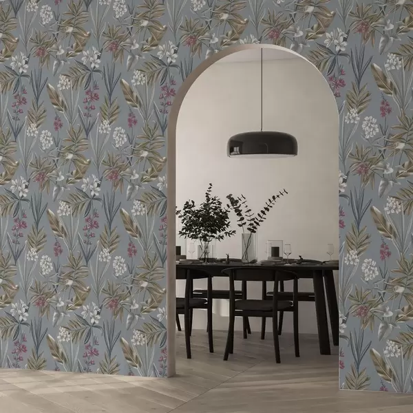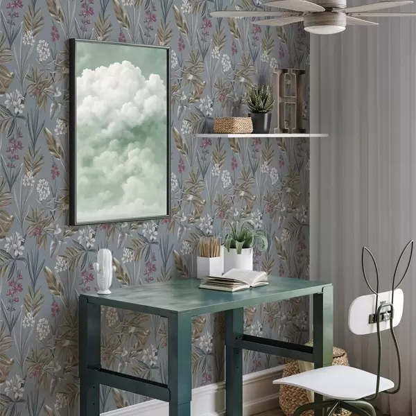 Tapet Blomstergrener på blågrå bakgrunn Nr. a00350