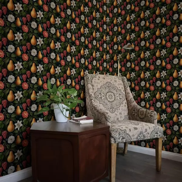 Tapet Barokke frukter og blomster på en dramatisk, mørk bakgrunn Nr. a00387