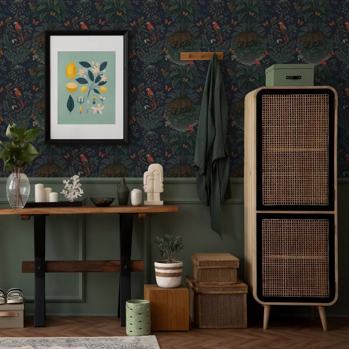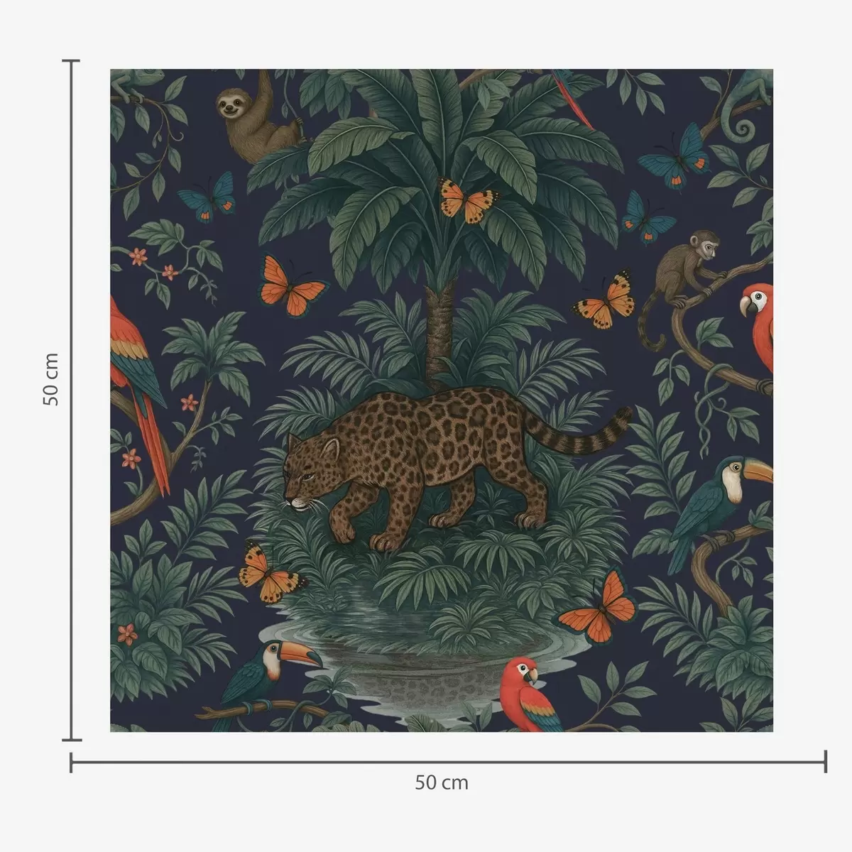 Tapet Tropisk jungel med leopard, leopard, papegøyer og sommerfugler Nr. a00388