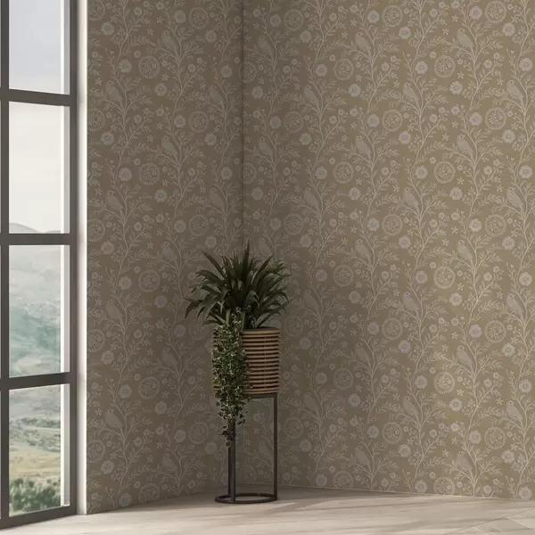 Tapet Delikat skisse av en hvit fugl og blomst hvit fugl og blomst på okerfarget bakgrunn Nr. a00393