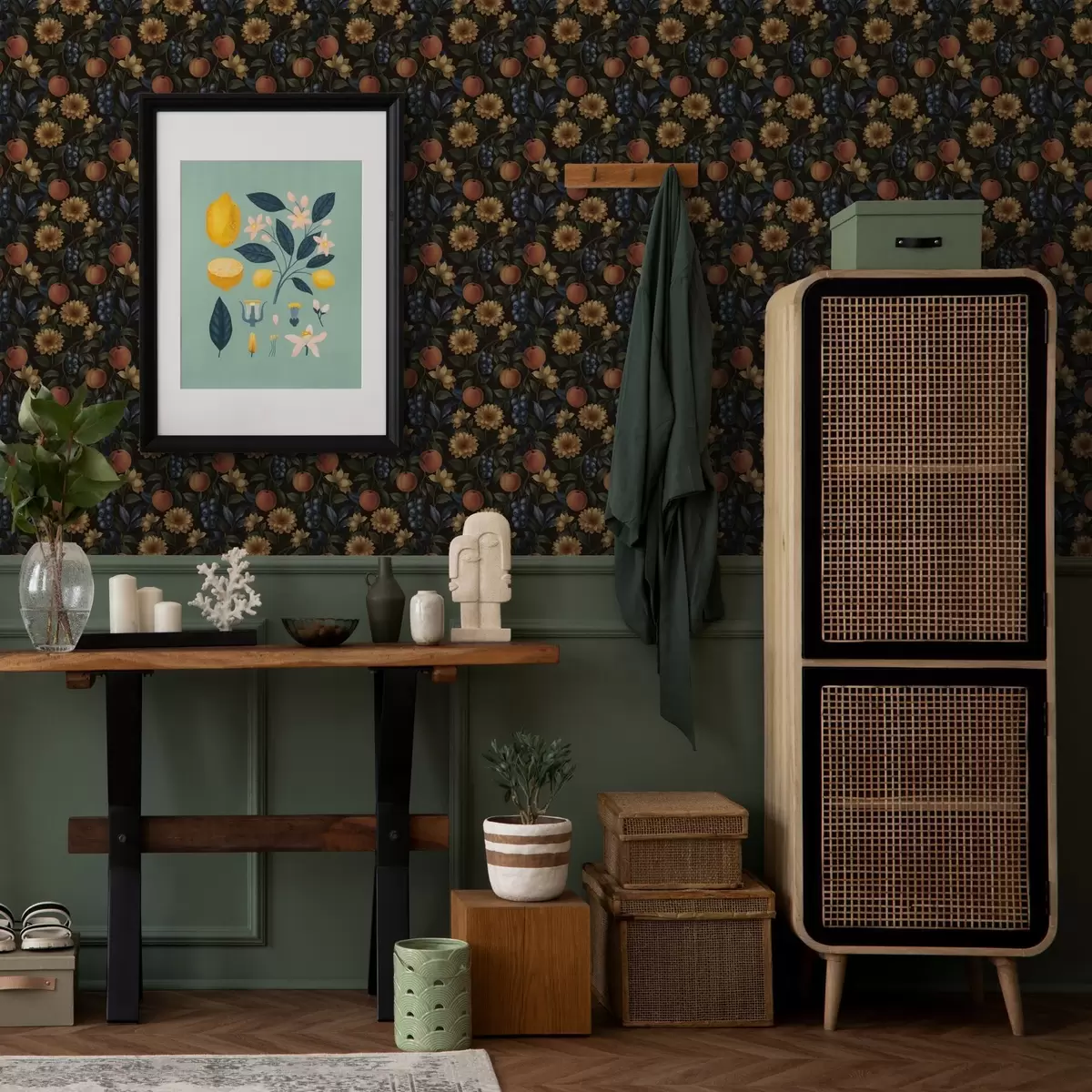 Tapet Frukt og gule blomster på mørk botanisk bakgrunn Nr. a00395