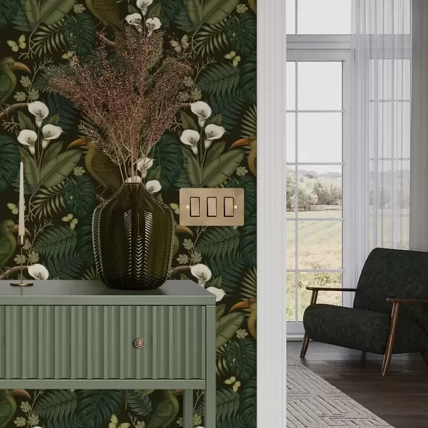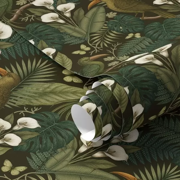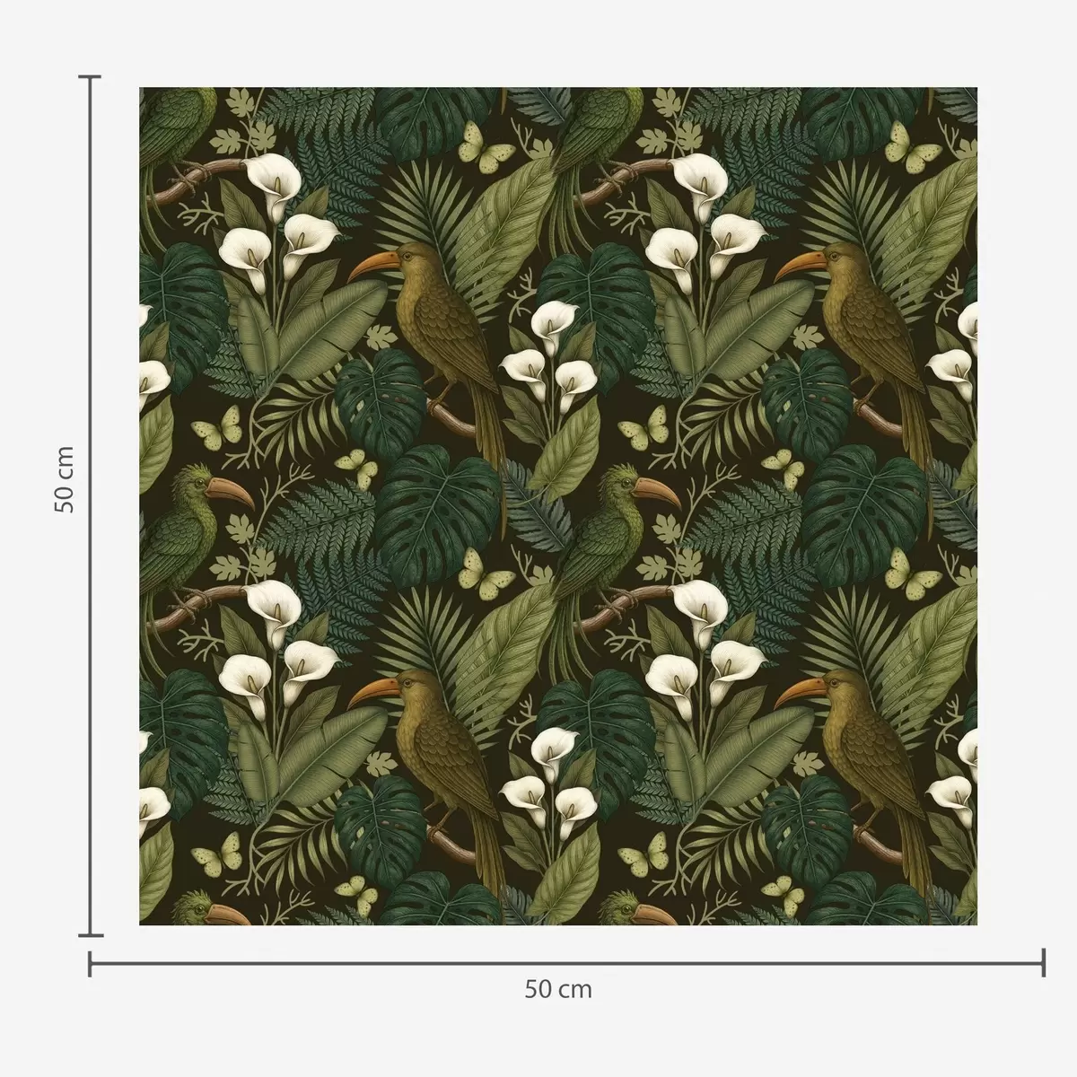 Tapet Tropiske fugler og frodig grønt på mørk jungelbakgrunn Nr. a00397