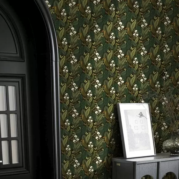 Tapet Tropiske fugler og frodig grønt på mørk jungelbakgrunn Nr. a00397