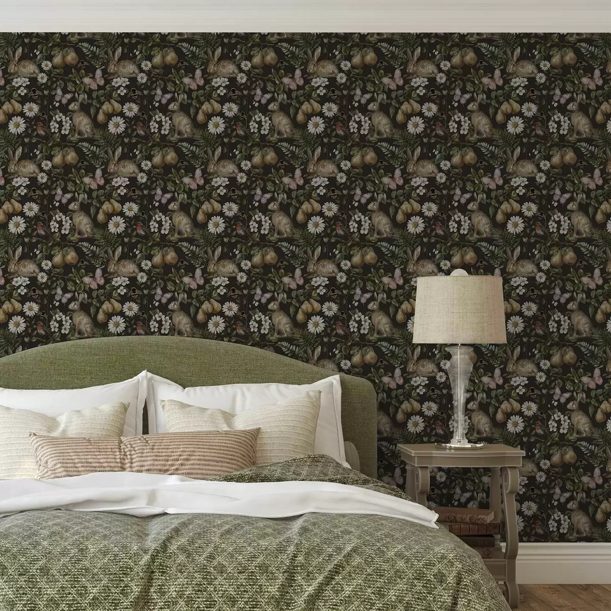 Tapet Realistiske kaniner, pærer, blomster og insekter på en mørk bakgrunn Nr. a00401