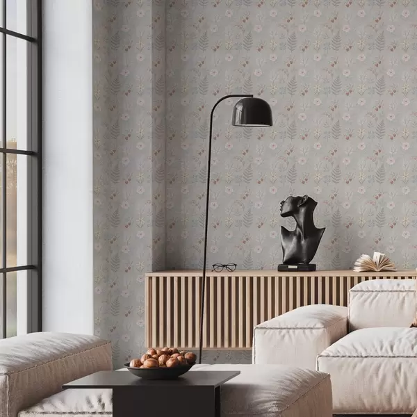 Tapet Pastellfargede blomster og bær på en lysegrå bakgrunn Nr. a00406