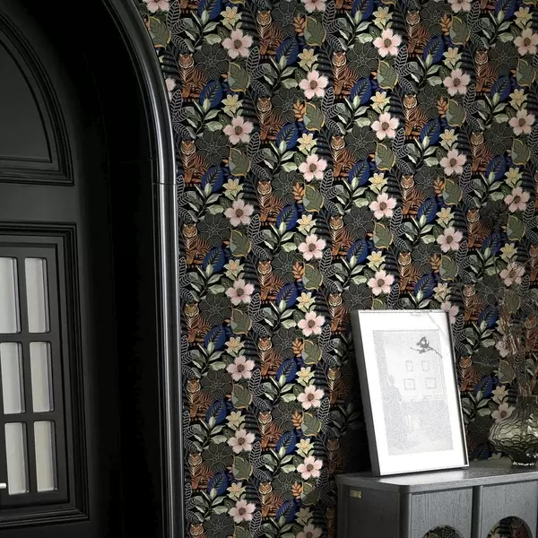 Tapet Tigre blant tropiske blomster og blader Nr. a00426