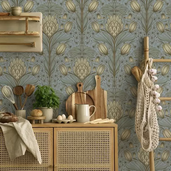 Tapet Blått mønster med artisjokker og tulipaner Nr. a00435
