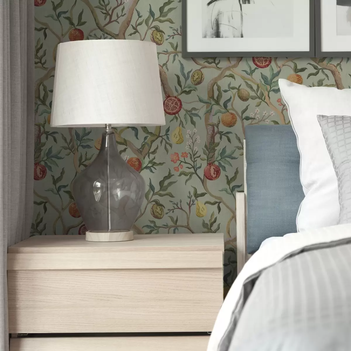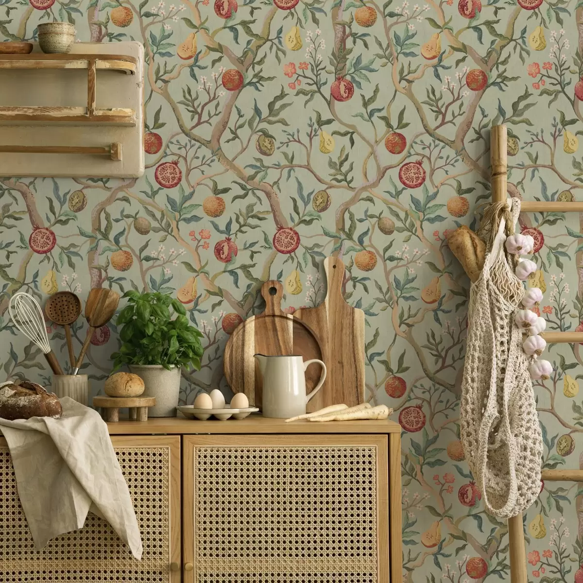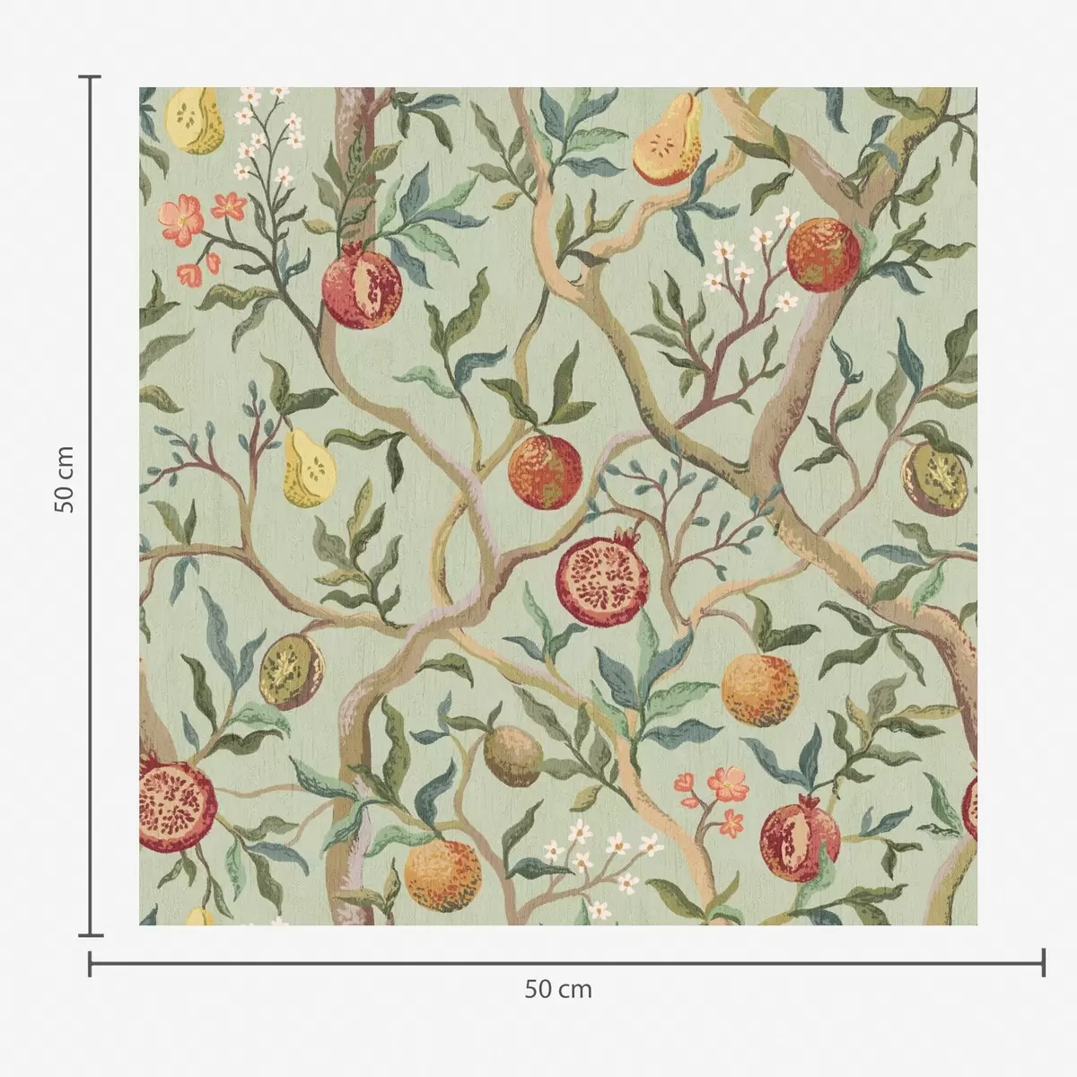 Tapet Granateplefrukter, pærer og blomster på en lysegrønn bakgrunn Nr. a00465