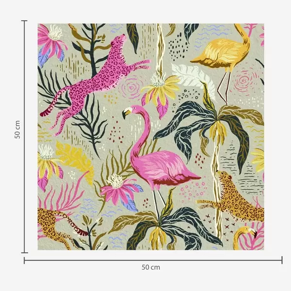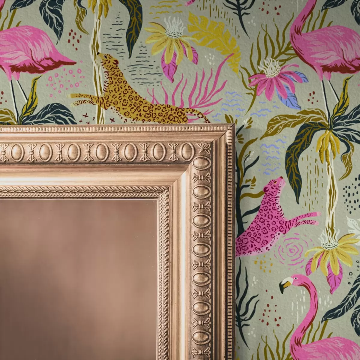 Tapet Lysende flamingoer og leoparder blant tropiske planter Nr. a00470