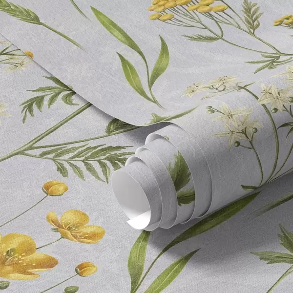 Tapet Gule blomster og grønne planter på en lysegrå bakgrunn Nr. a00472