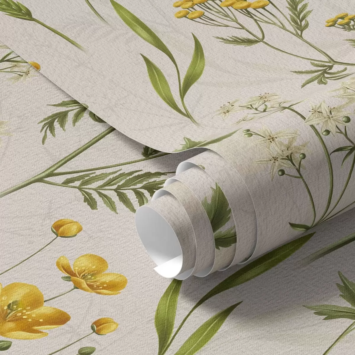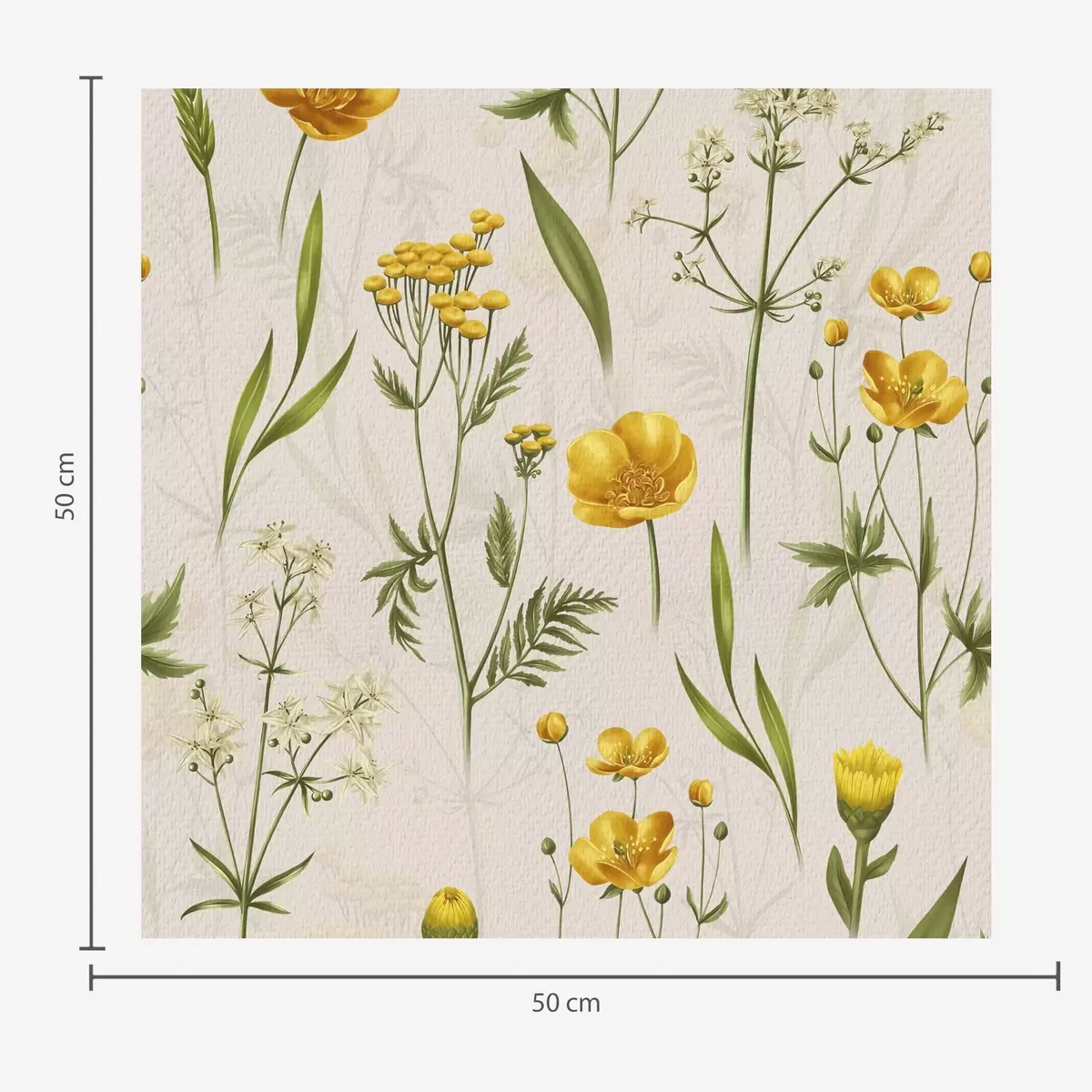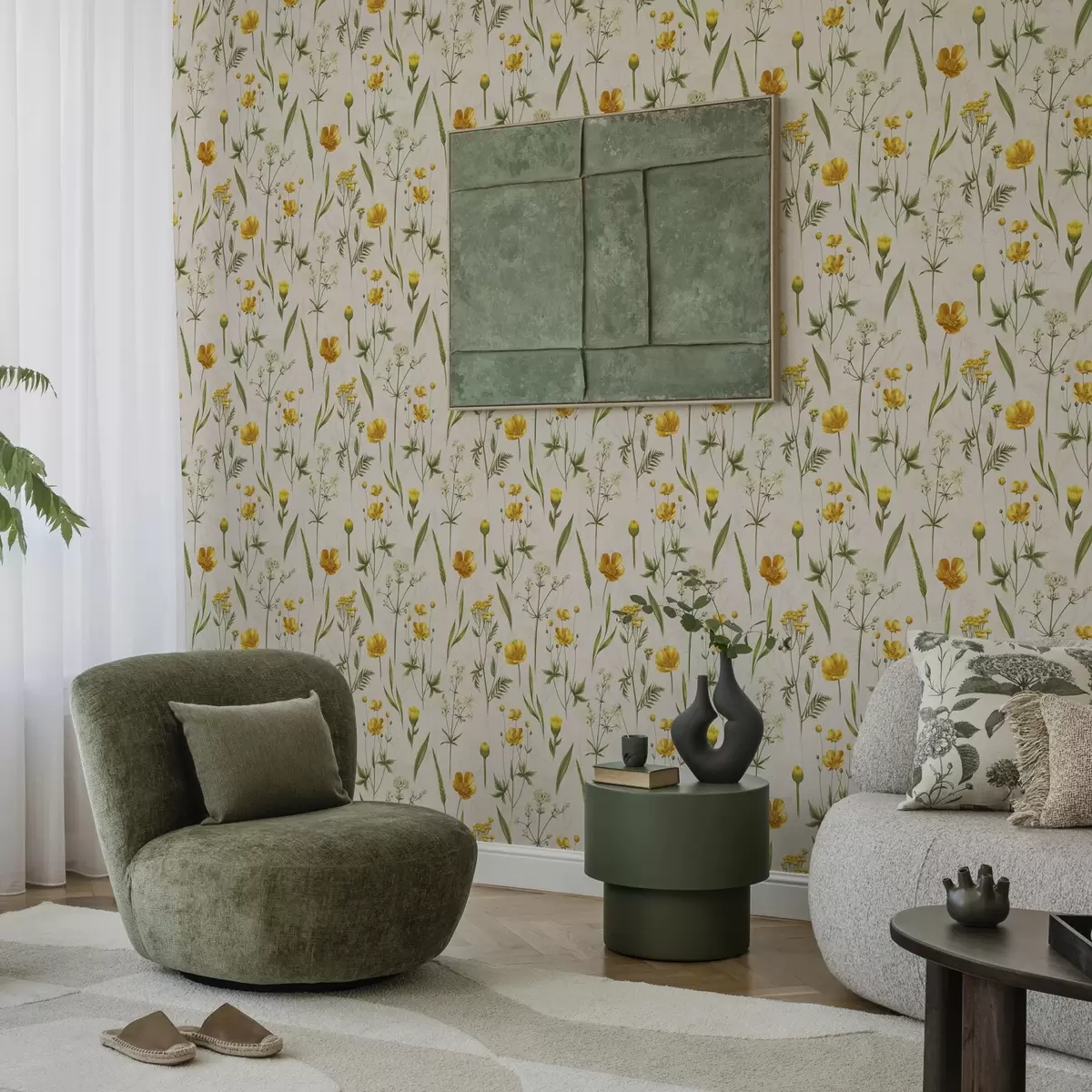 Tapet Gule blomster og grønne planter på beige bakgrunn Nr. a00472v2