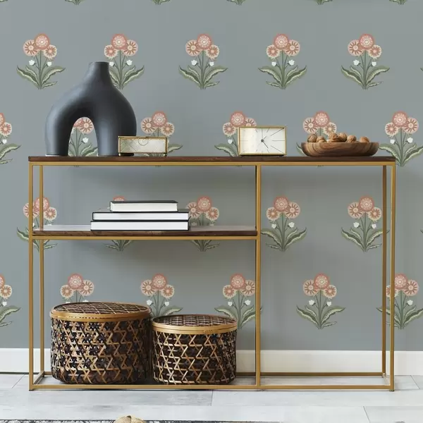Tapet Stiliserte blomster på gråblå bakgrunn, varm fargepalett Nr. a00494
