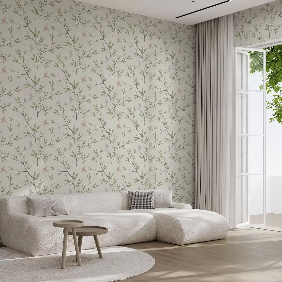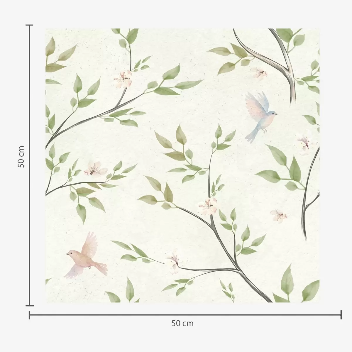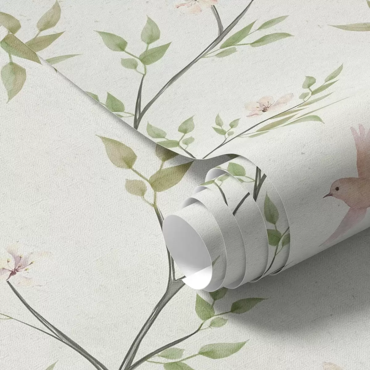 Tapet Akvarellgrener med blader og fugler på lys bakgrunn Nr. a00496