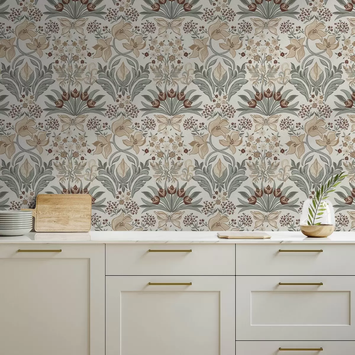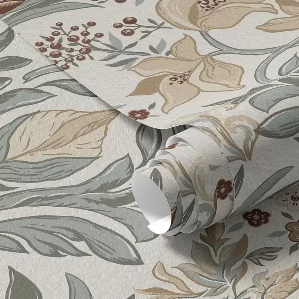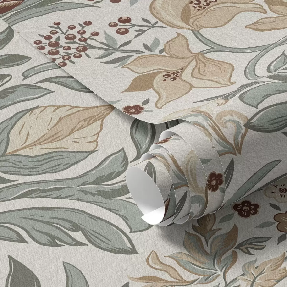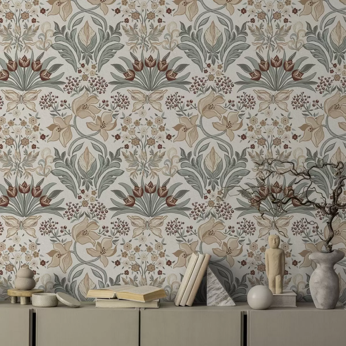 Tapet Dekorative liljer og en sommerfugl på kremfarget bakgrunn Nr. a00500