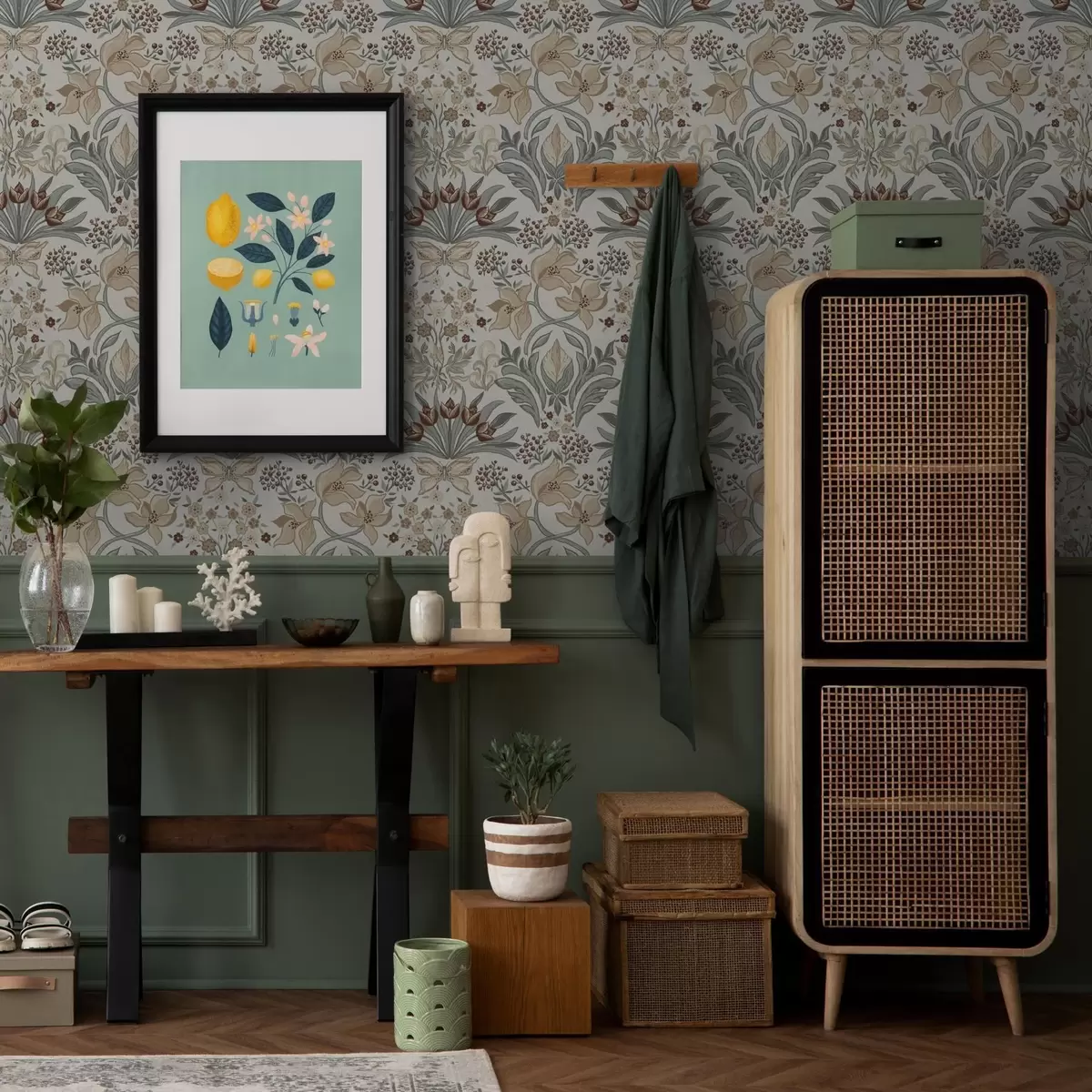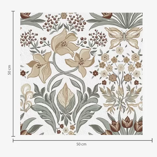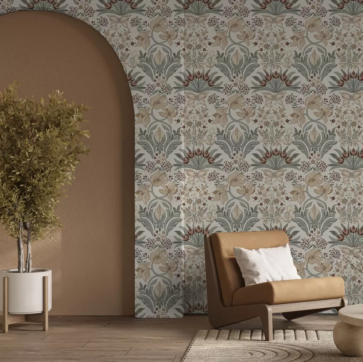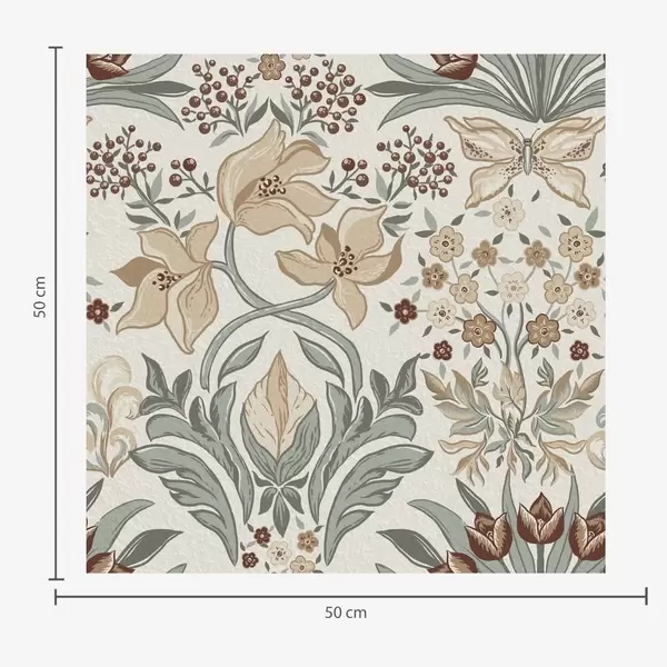 Tapet Dekorative liljer og en sommerfugl på kremfarget bakgrunn Nr. a00500