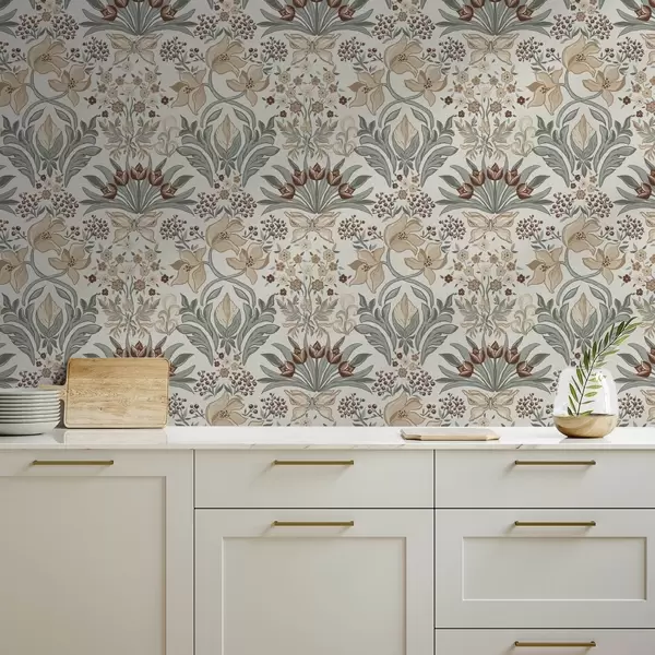 Tapet Dekorative liljer og en sommerfugl på kremfarget bakgrunn Nr. a00500