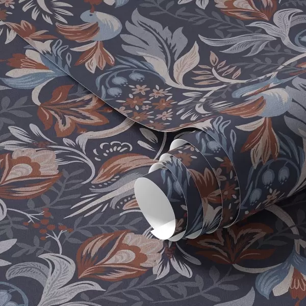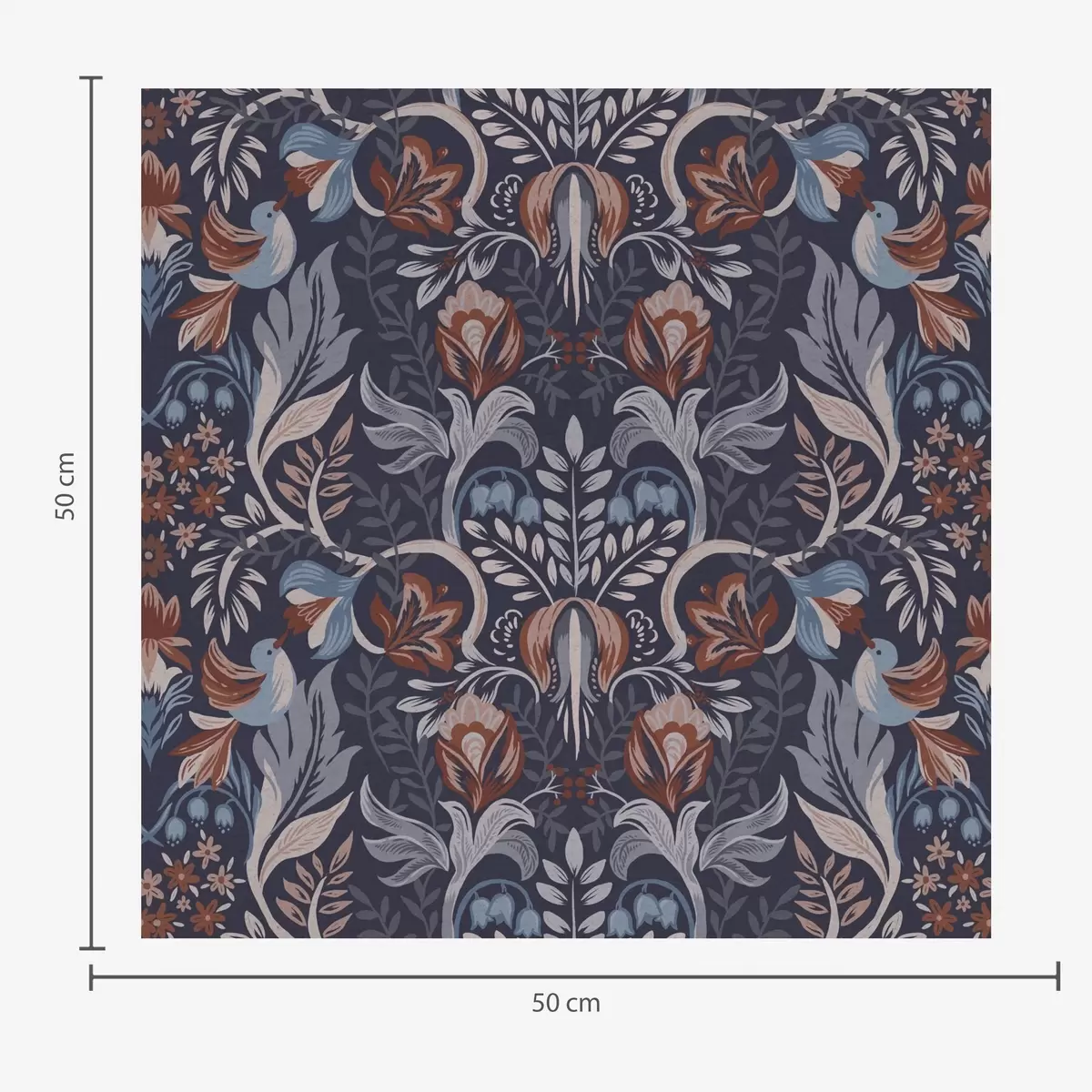 Tapet Folkemotiver med blomster og fugler på mørkeblå bakgrunn Nr. a00502