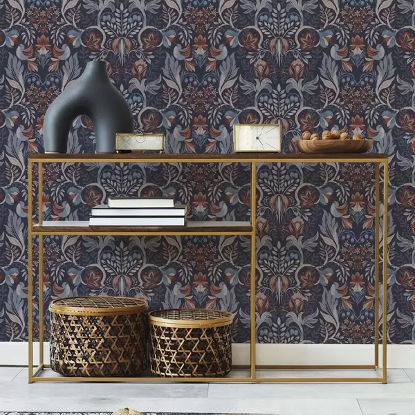 Tapet Folkemotiver med blomster og fugler på mørkeblå bakgrunn Nr. a00502