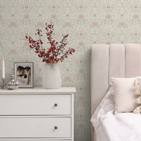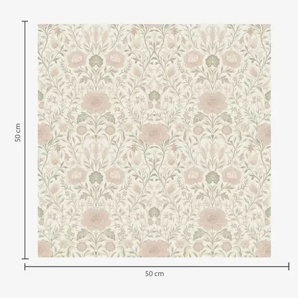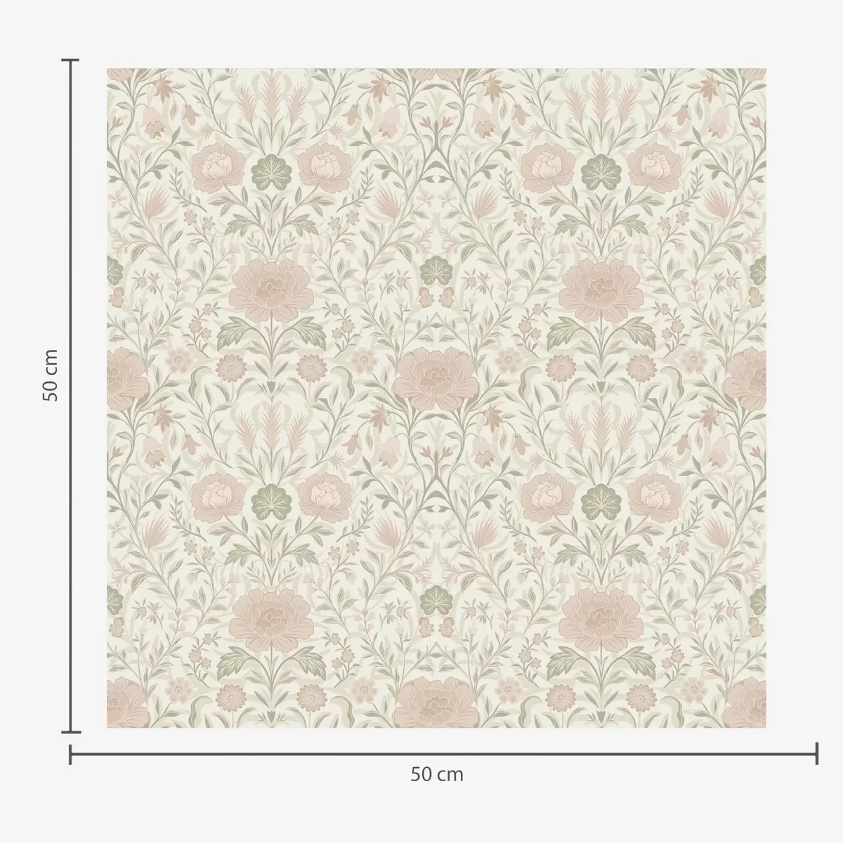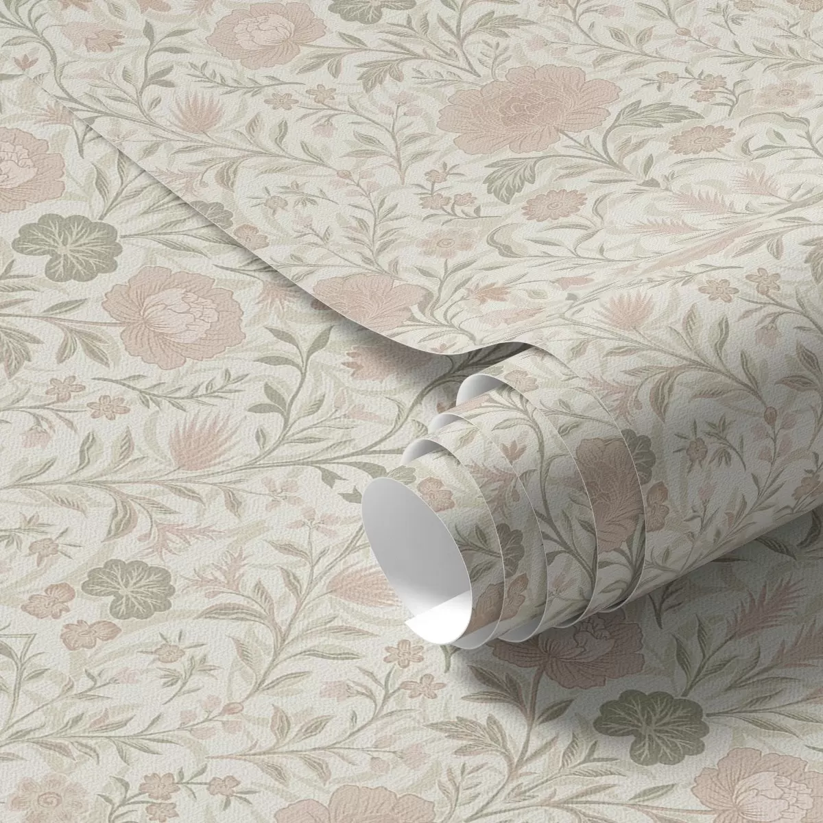 Tapet Morris-stil: pioner og gress i myke beige-grønne farger Nr. a00581