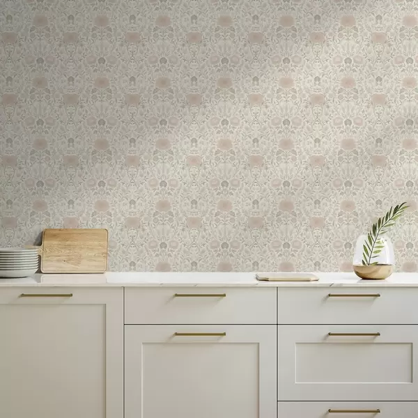 Tapet Morris-stil: pioner og gress i myke beige-grønne farger Nr. a00581