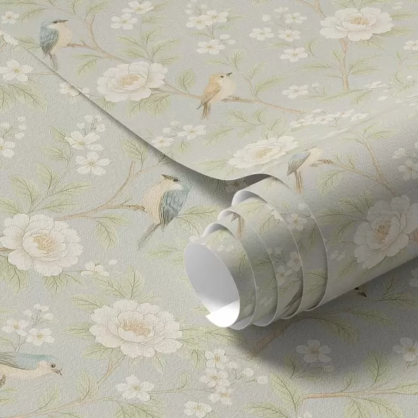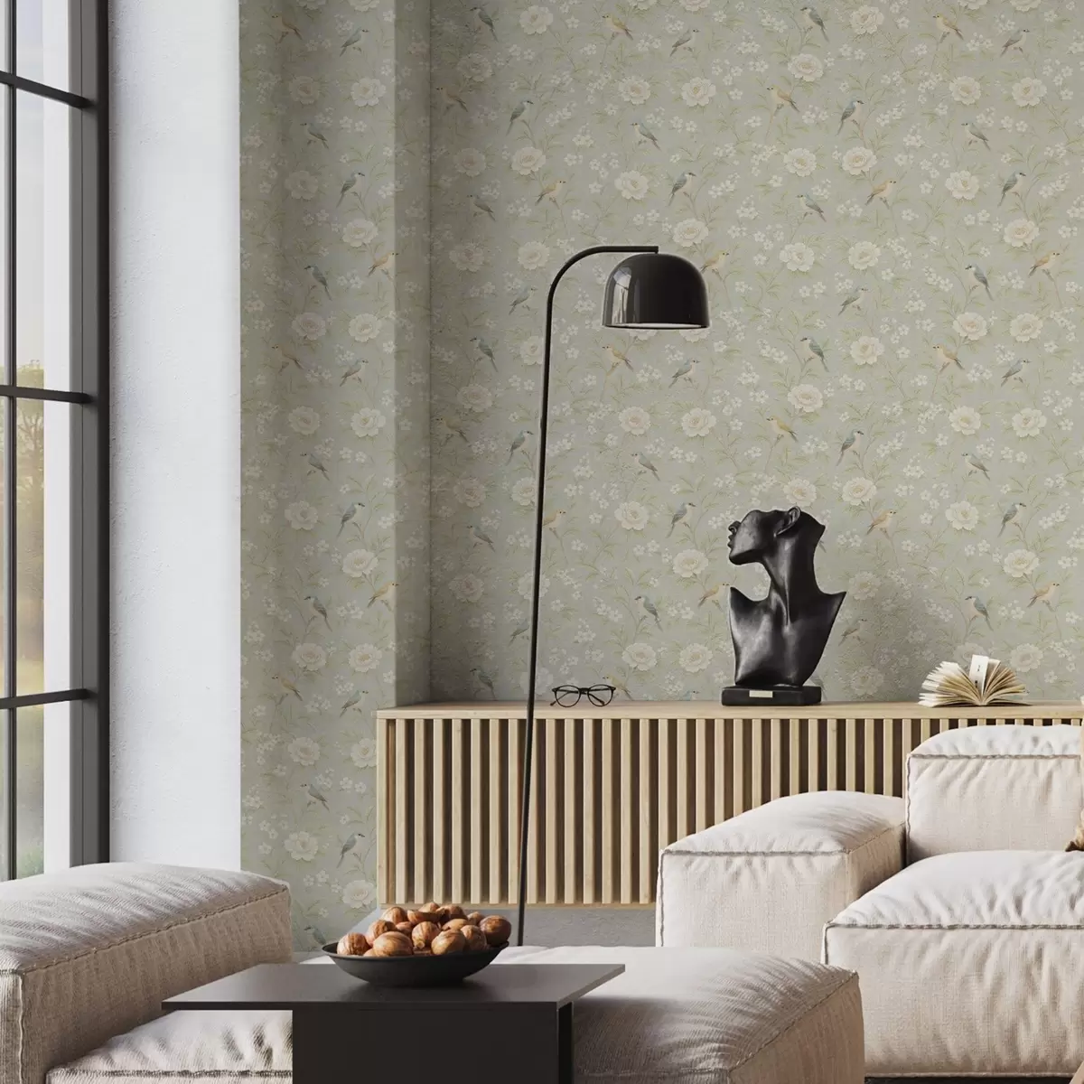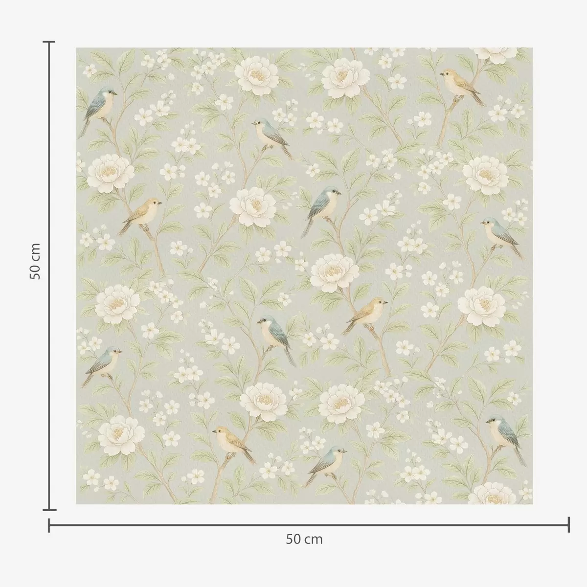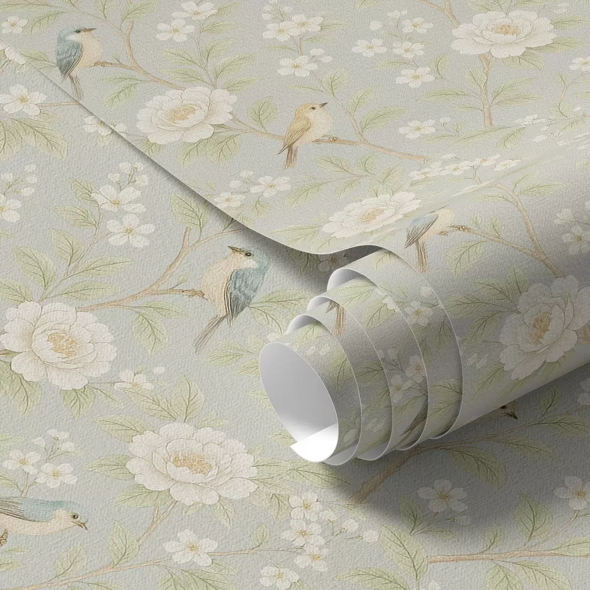 Tapet Fugler blant hvite blomster på en grågrønn bakgrunn Nr. a00583