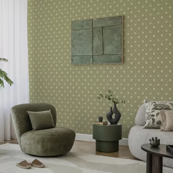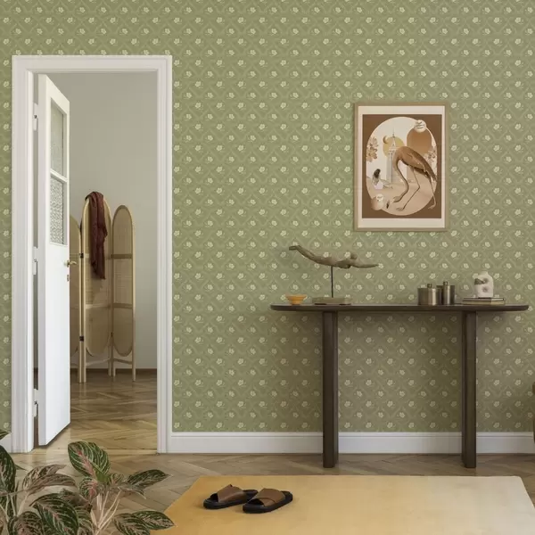 Tapet Oliven trellis med kremfargede blomster, retro ornament Nr. a00585